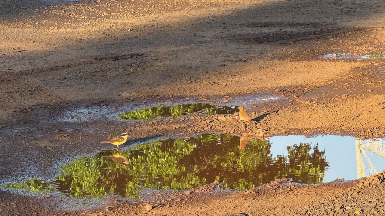 In großen Pfützen planschen die Vöglein, wir beneiden sie. So ein See wäre uns auch sehr willkommen bei der Gluthitze…