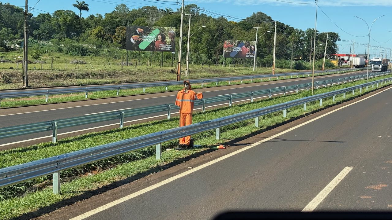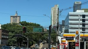 Foz de Iguazu. In der Stadt sehen wir die ersten Hinweisschilder zu den Grenzen nach Argentinien und Paraguay. Ein Dreiländereck.