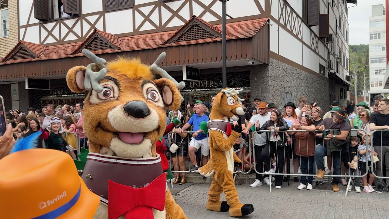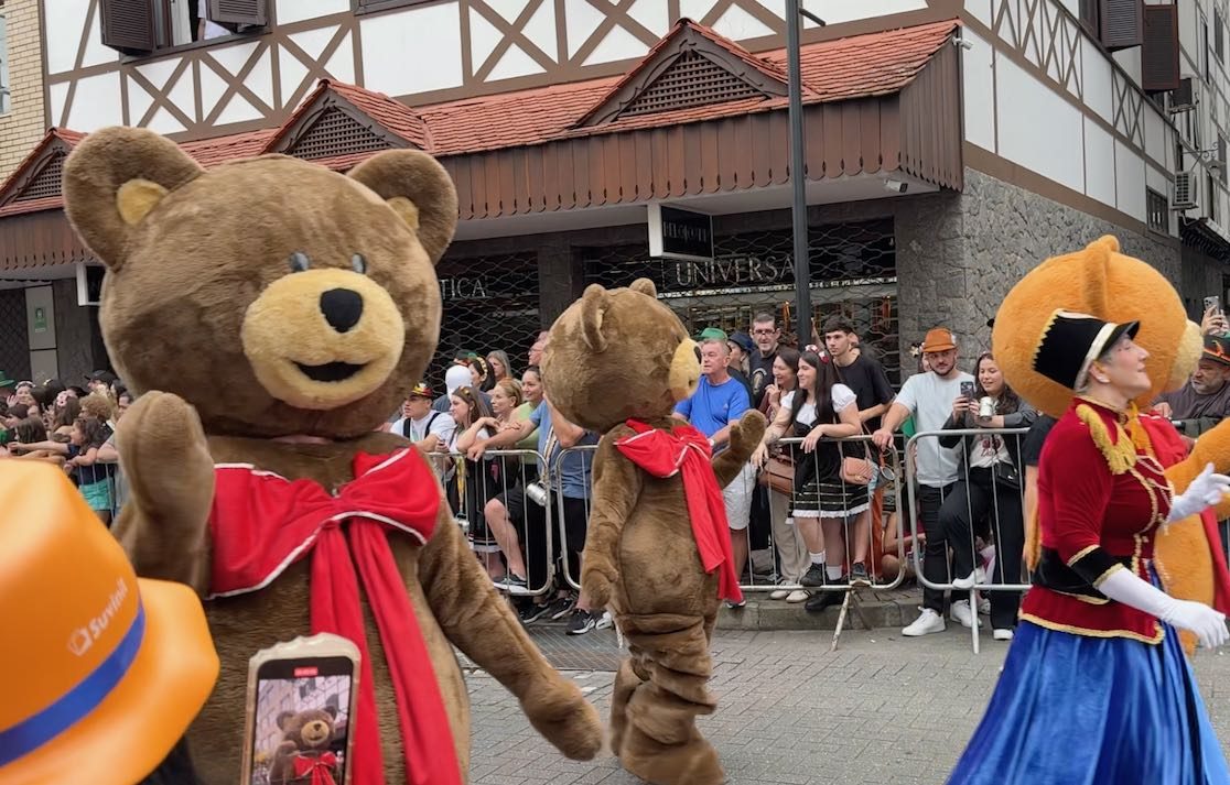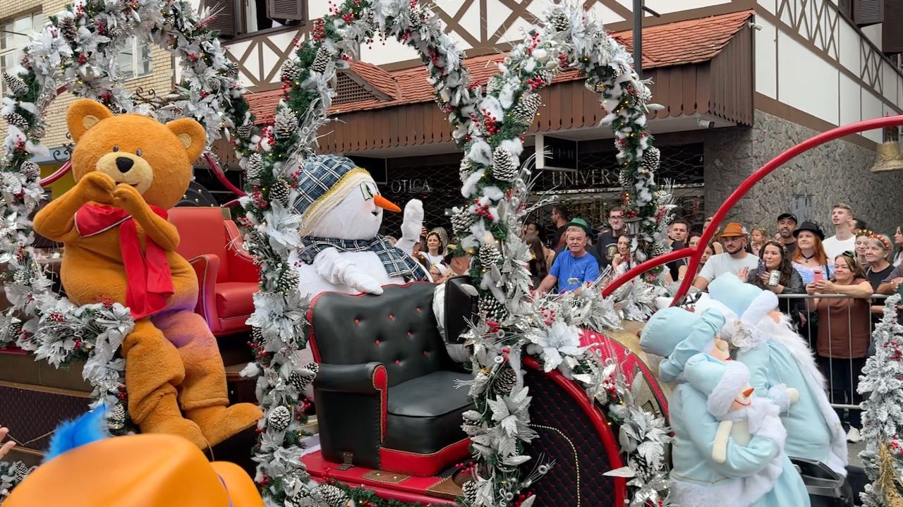 Der erste Umzugswagen überrascht uns etwas. Elche und Teddybären laufen vorneweg, ein fröhlicher Schneemann winkt vom winterlich geschmückten Wagen. Vorschau auf Weihnachten.