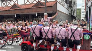 Fahrende Theken, Volkstanz und praktische Maßkrughalter an den Fahrradlenkern.
