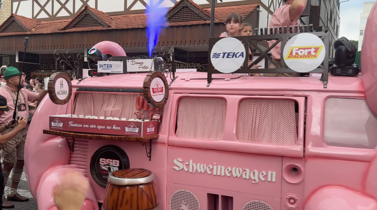 Ein umgebauter VW-Bulli, der Schweinewagen, kommt mit Dampf und Feuerwerk