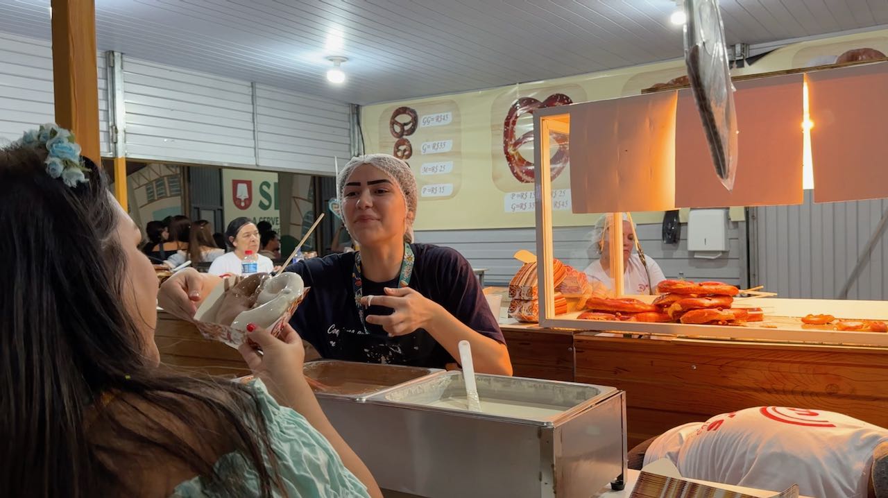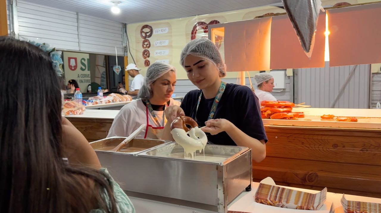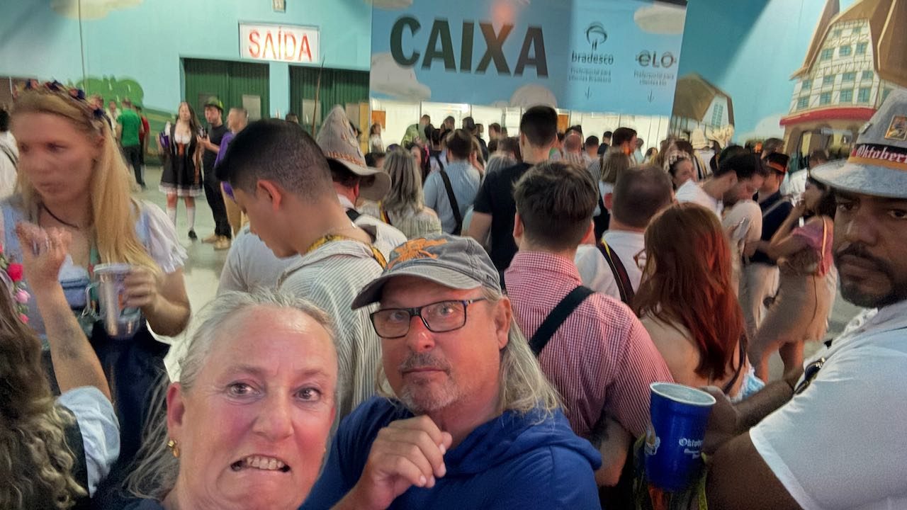 Unser Guthaben auf der Oktoberfestkarte ist leer, Schlange stehen vor der Caixa um sie wieder aufzuladen.