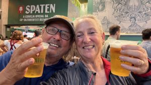 Manchmal wird Bier an uns Zuschauer verteilt, ich kann einen Becher ergattern!