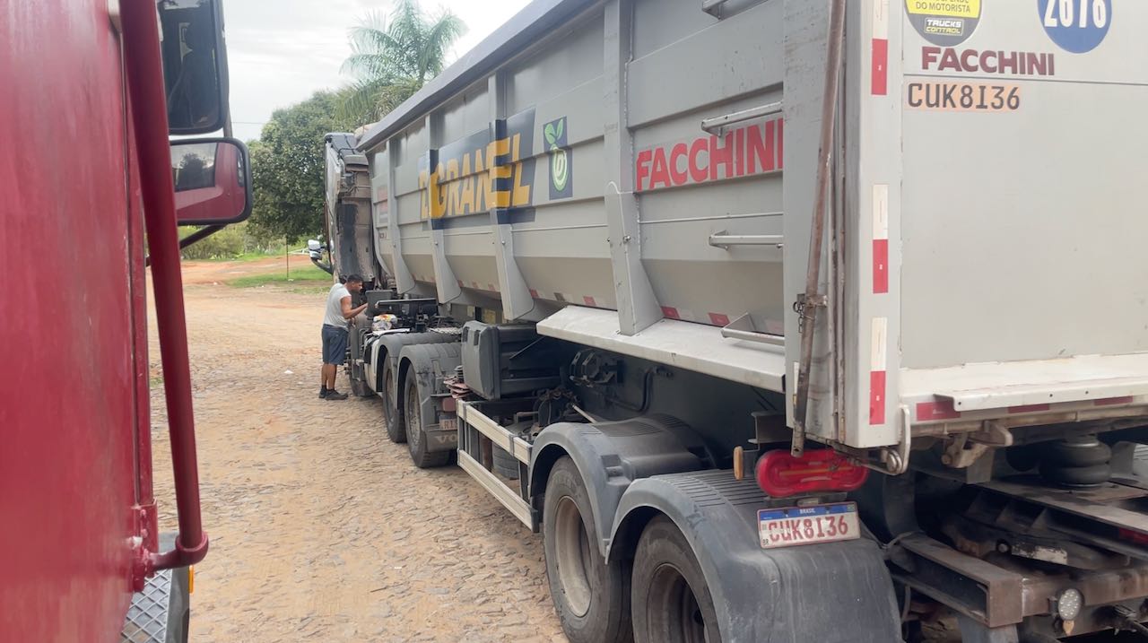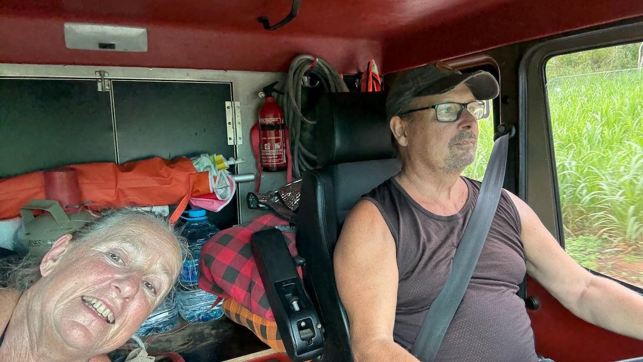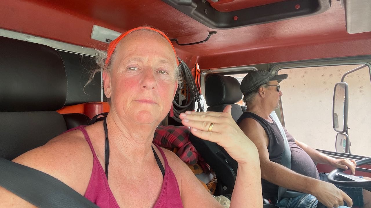 Halb neun Uhr morgens, die Lkws um uns rum sind schon im Morgengrauen gestartet.