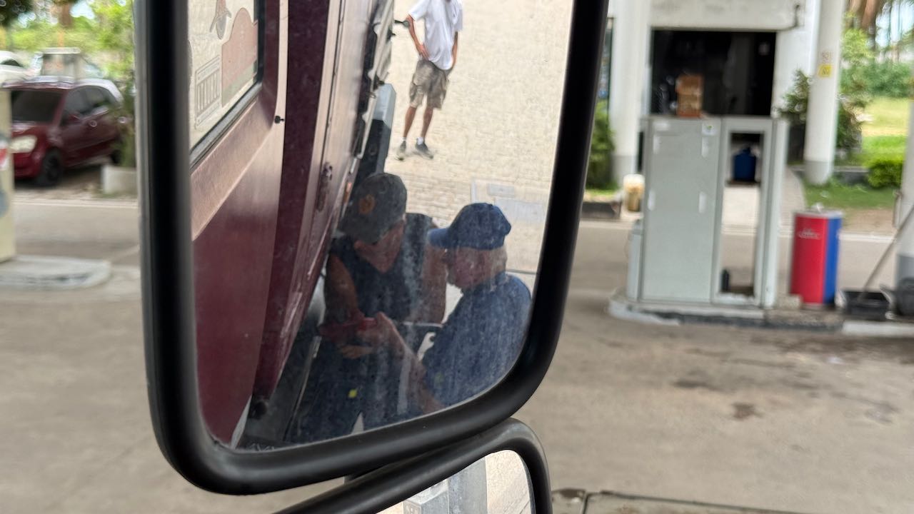 273 Kilometer haben wir geschafft, sehr anstrengend in der Hitze. Bei einer kleinen IPI MAX Tankstelle ist Schluss für heute.