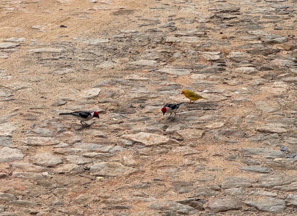 Wir sitzen auf der Treppe und schwitzen vor uns hin. Kardinalvögel und Goldtangaren hüpfen herum.