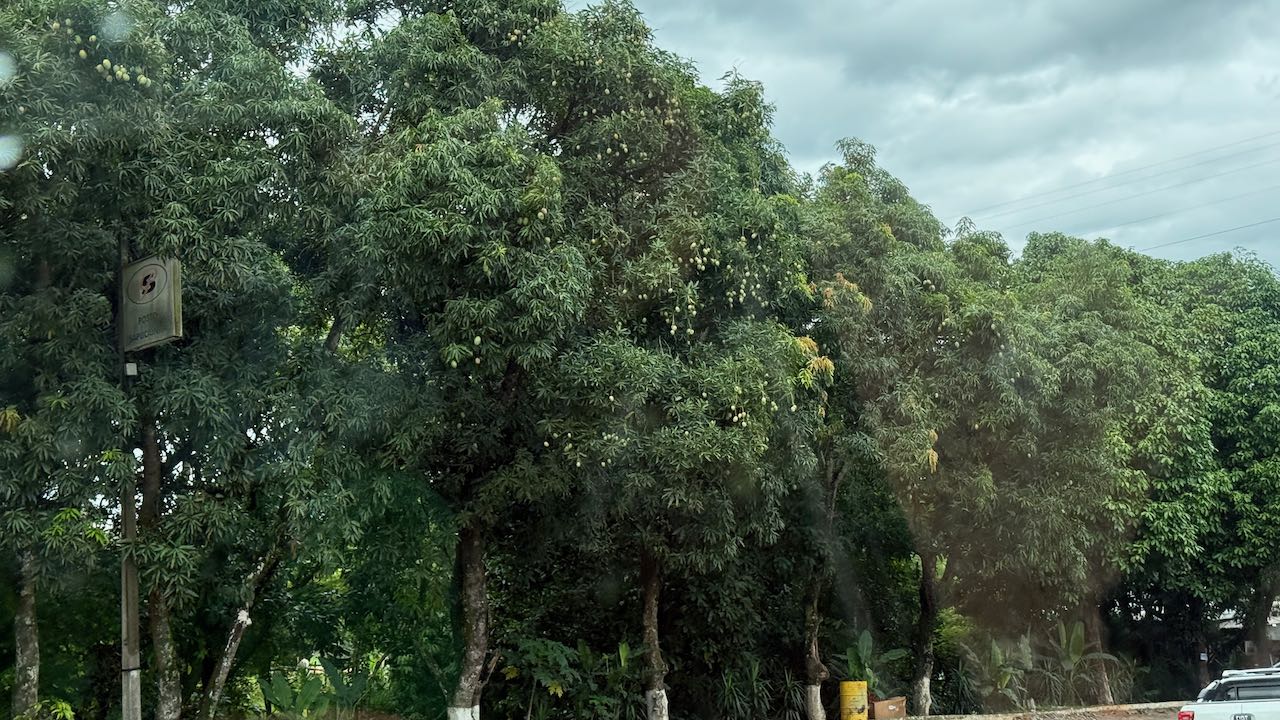 Die Mangobäume hängen voller noch grüner Früchte. Undurchdringlicher Dschungel und samtig grüne Hügel. Häuser stapeln sich auf den Hängen.