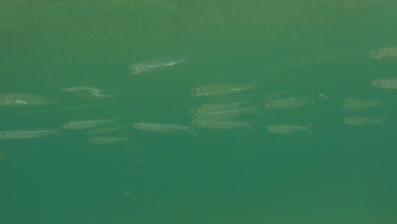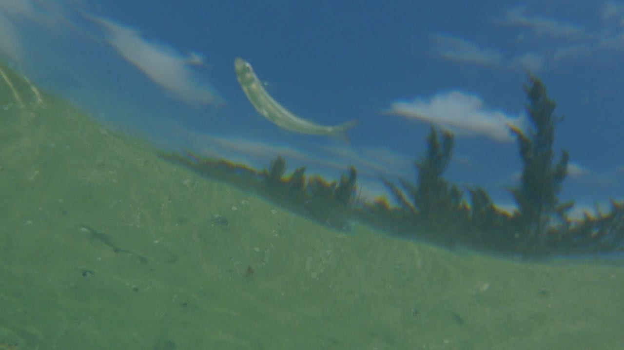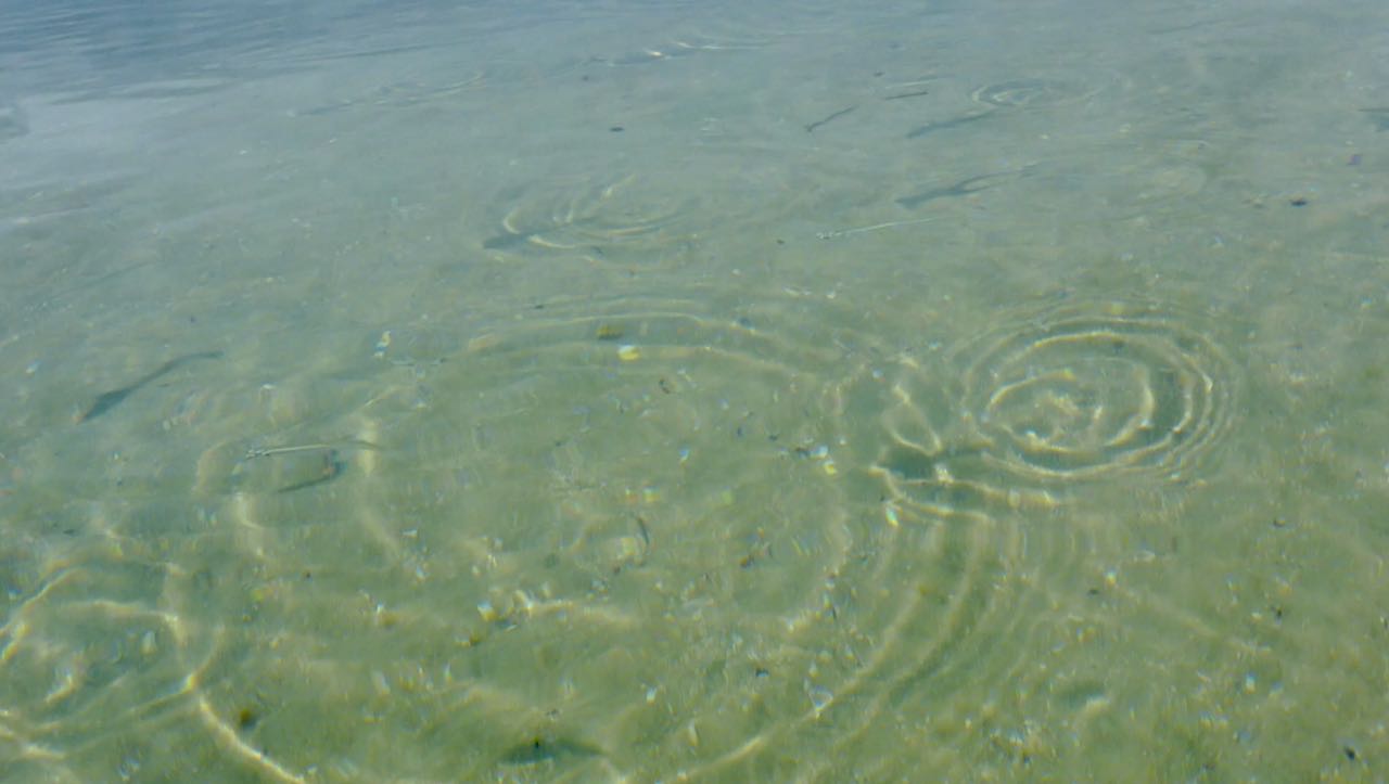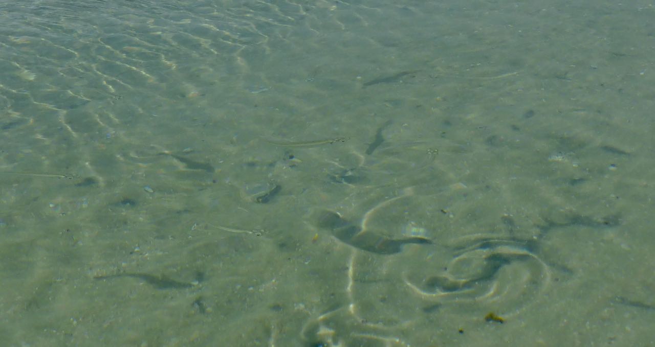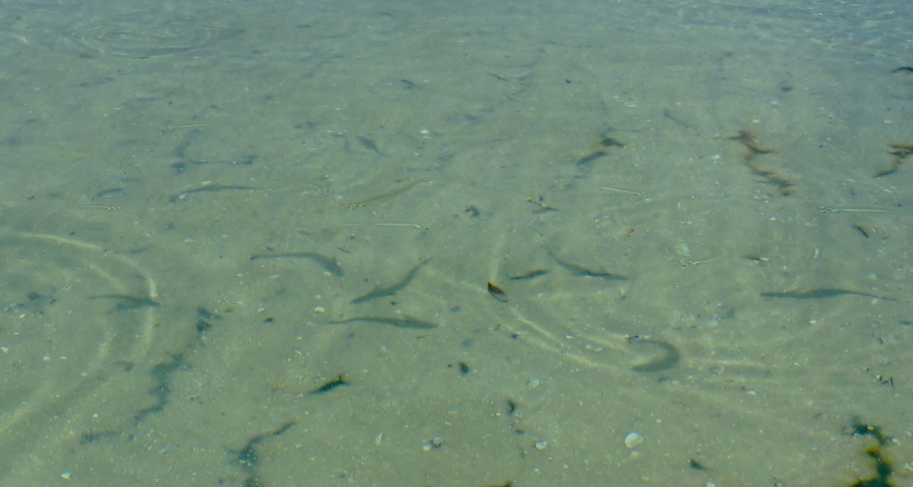 Auf der Oberfläche enstehen kleine Wirbel. Zuerst sieht man nur Schatten, die sich bewegen. Erst bei ganz genauem Hinsehen, kann man unzählige, fast durchsichtige Fische erkennen.