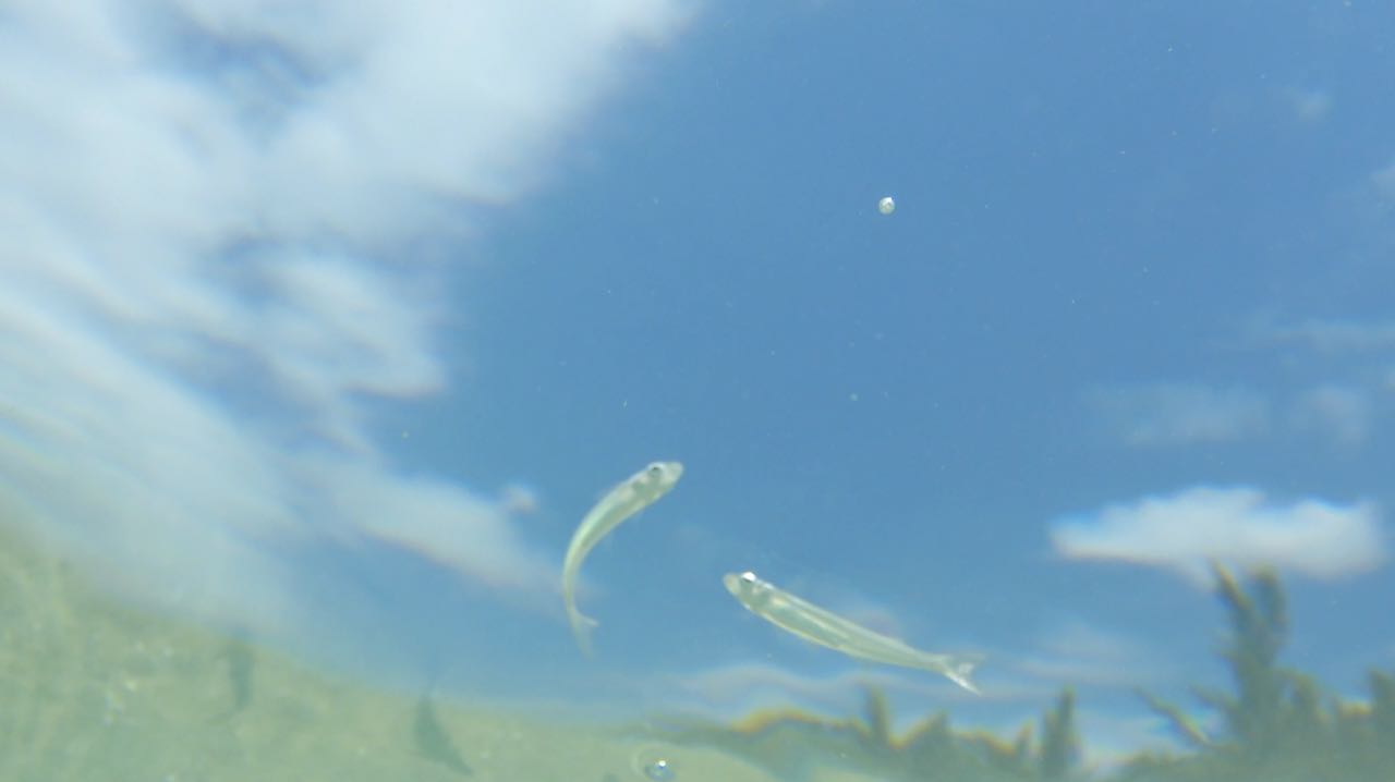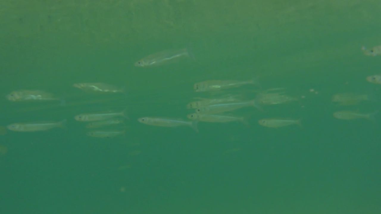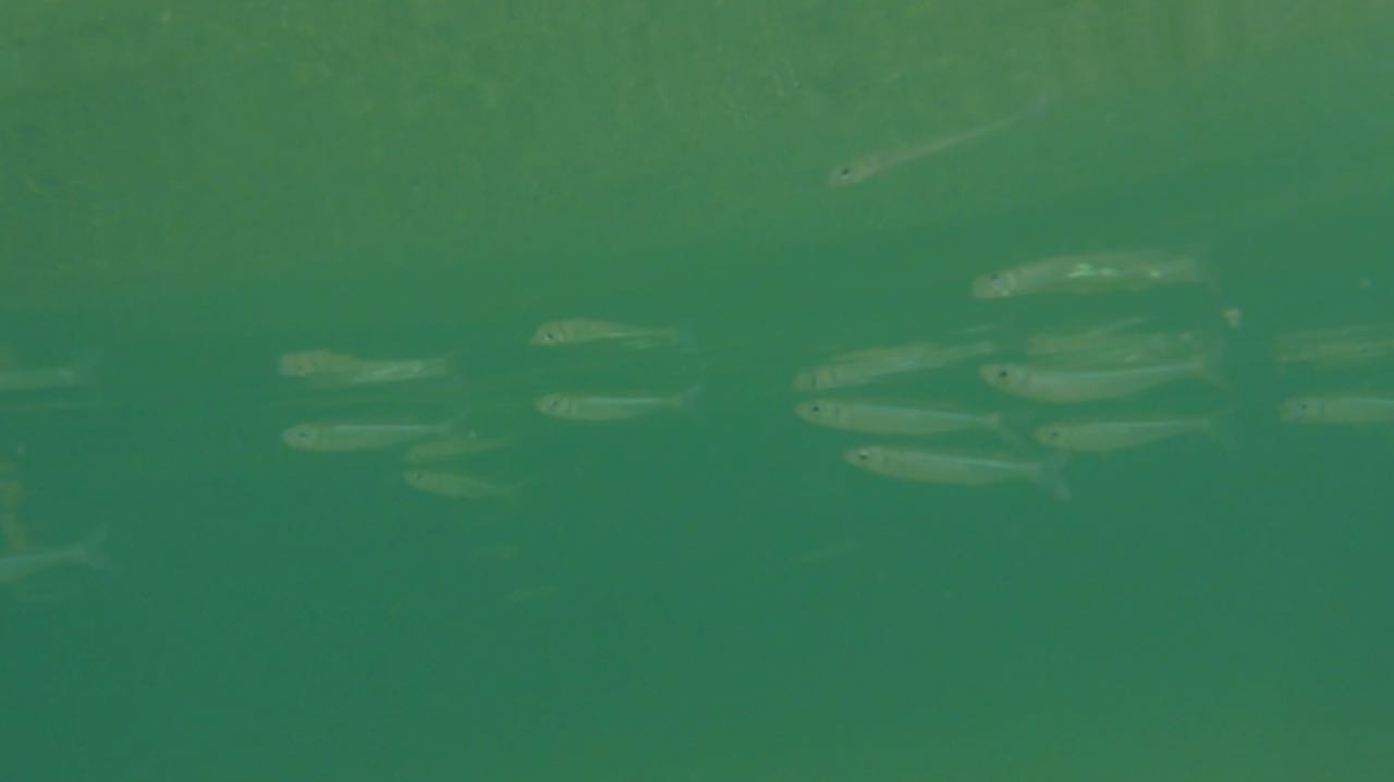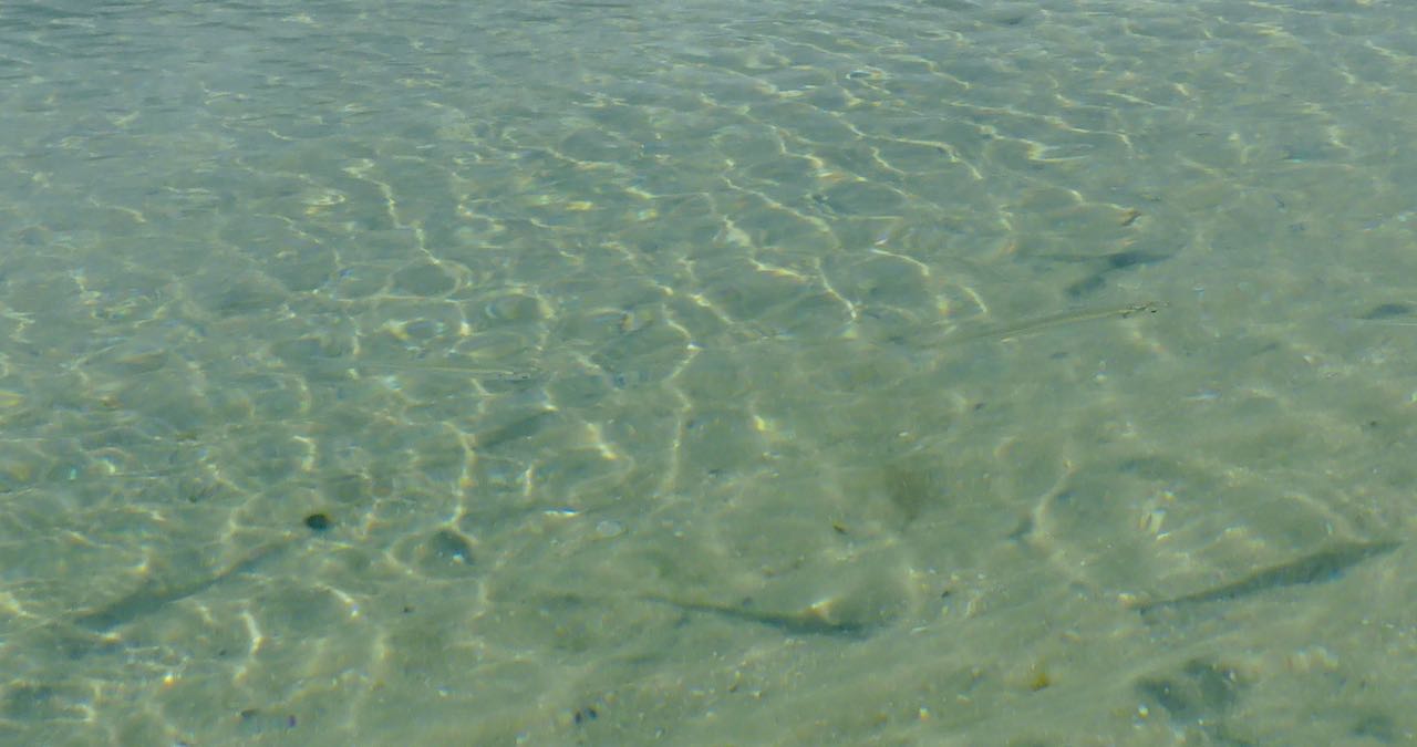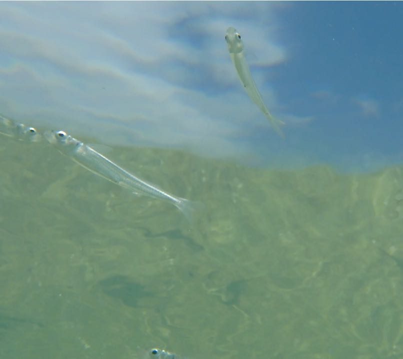 Auf der Oberfläche enstehen kleine Wirbel. Zuerst sieht man nur Schatten, die sich bewegen. Erst bei ganz genauem Hinsehen, kann man unzählige, fast durchsichtige Fische erkennen.