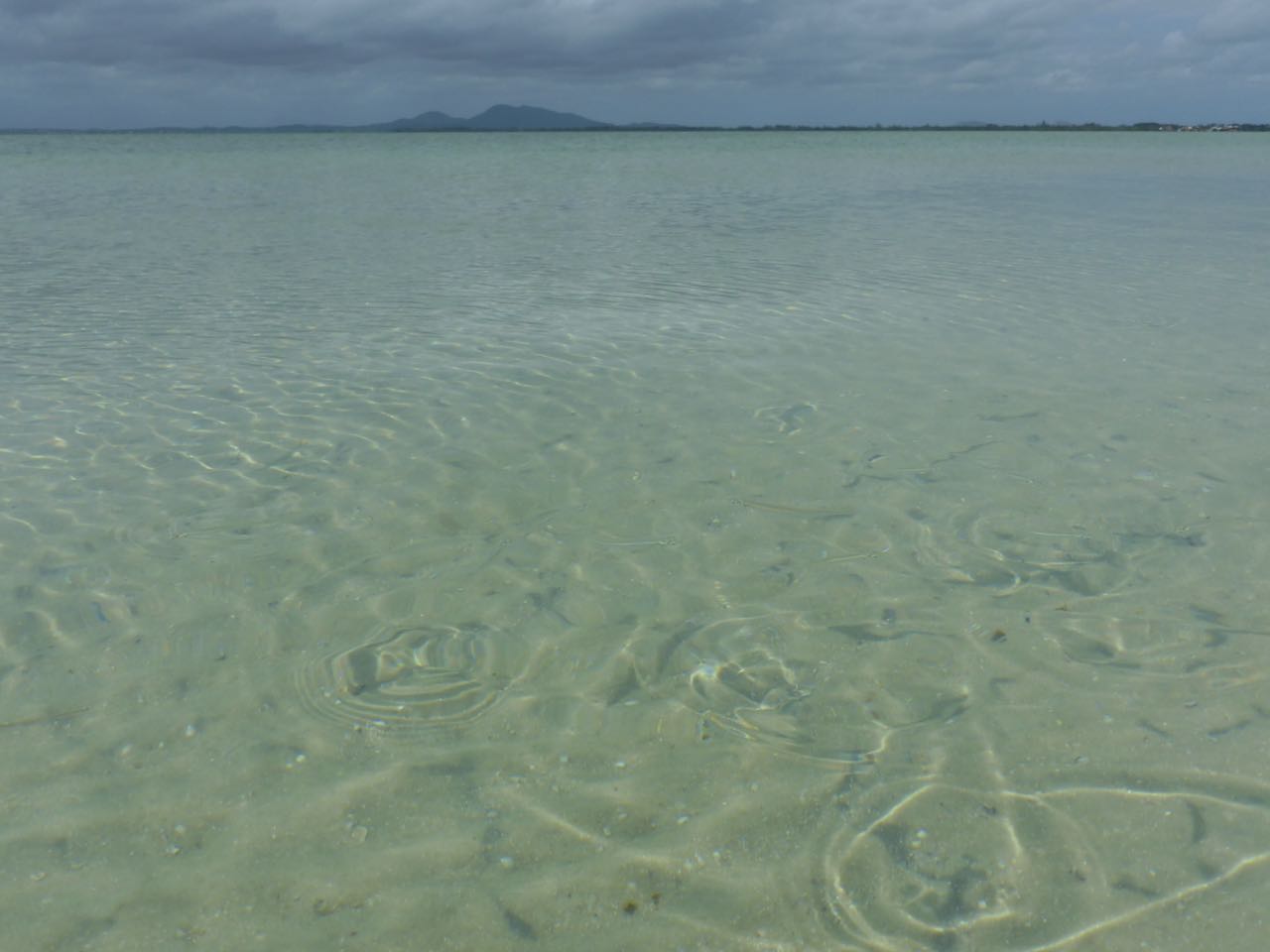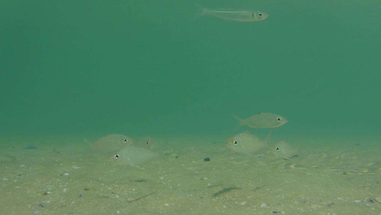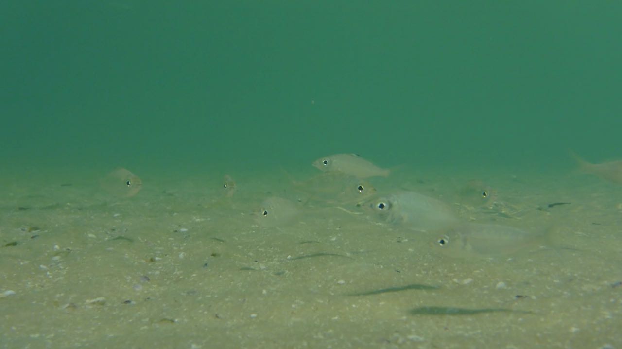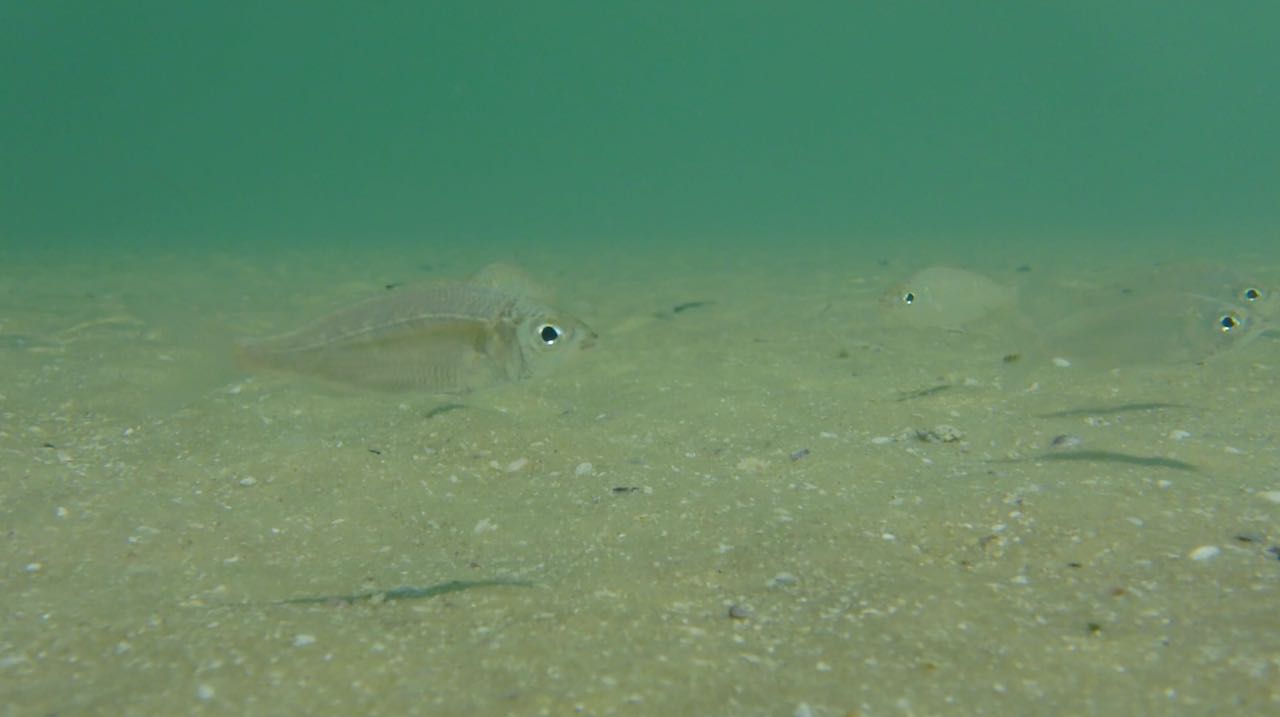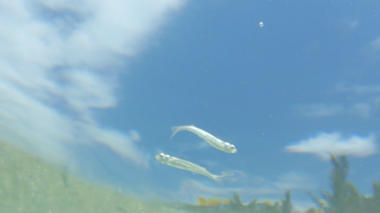 Auf der Oberfläche enstehen kleine Wirbel. Zuerst sieht man nur Schatten, die sich bewegen. Erst bei ganz genauem Hinsehen, kann man unzählige, fast durchsichtige Fische erkennen.