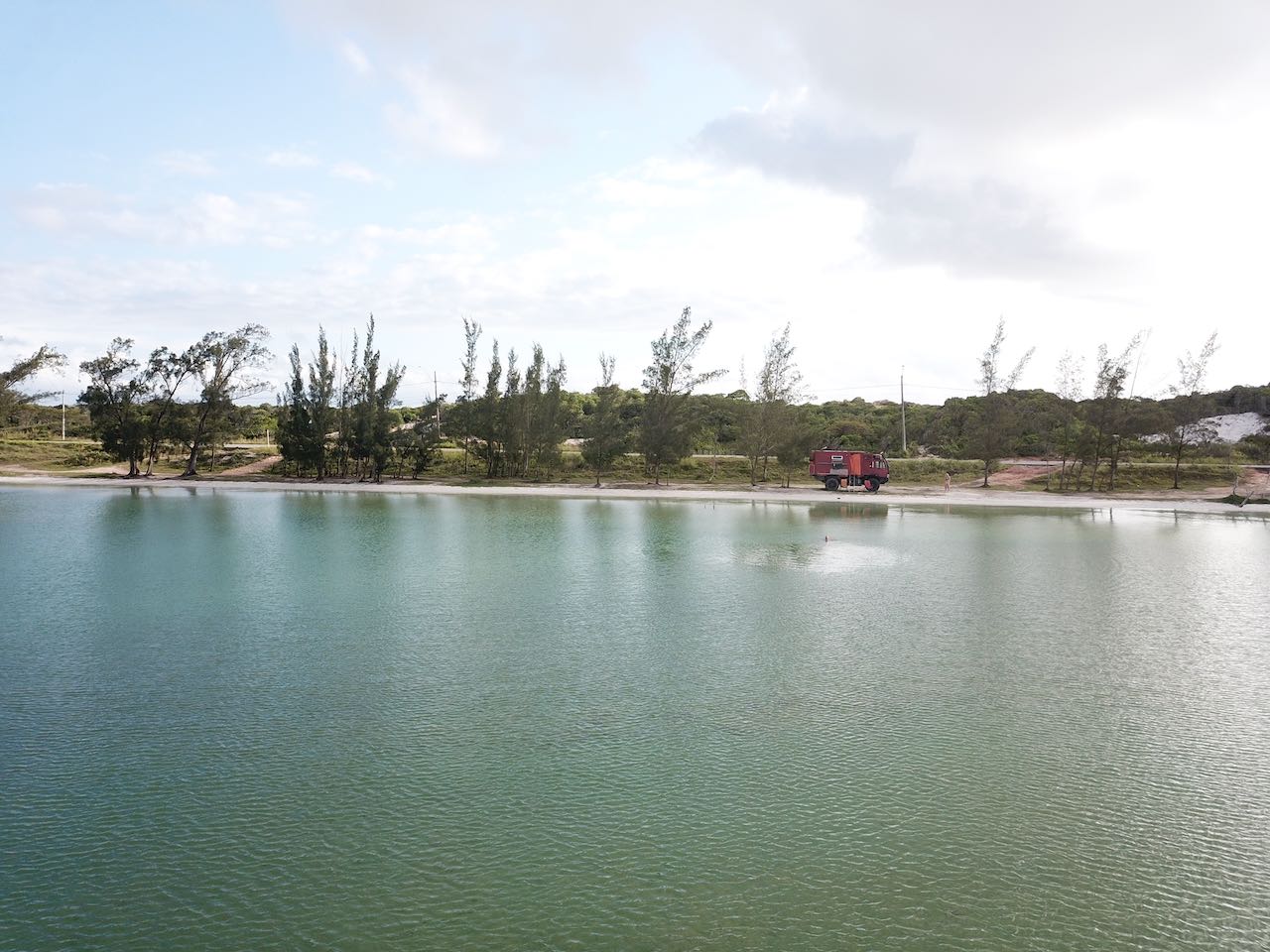 Der Wind hat nochmal zugelegt, die rote Fahne ist gehisst. Kräftige Wellen, nur ganz vorne in Ufernähe können wir ins Wasser.