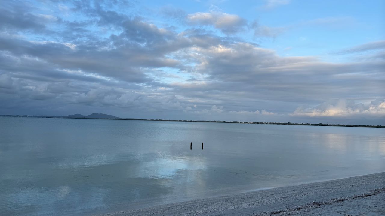 Rechts und links von der Kapelle liegen Strände, goldgelb und grobkörnig. Am langen Strand links könnten wir uns auch hinstellen aber…..kein Schatten!