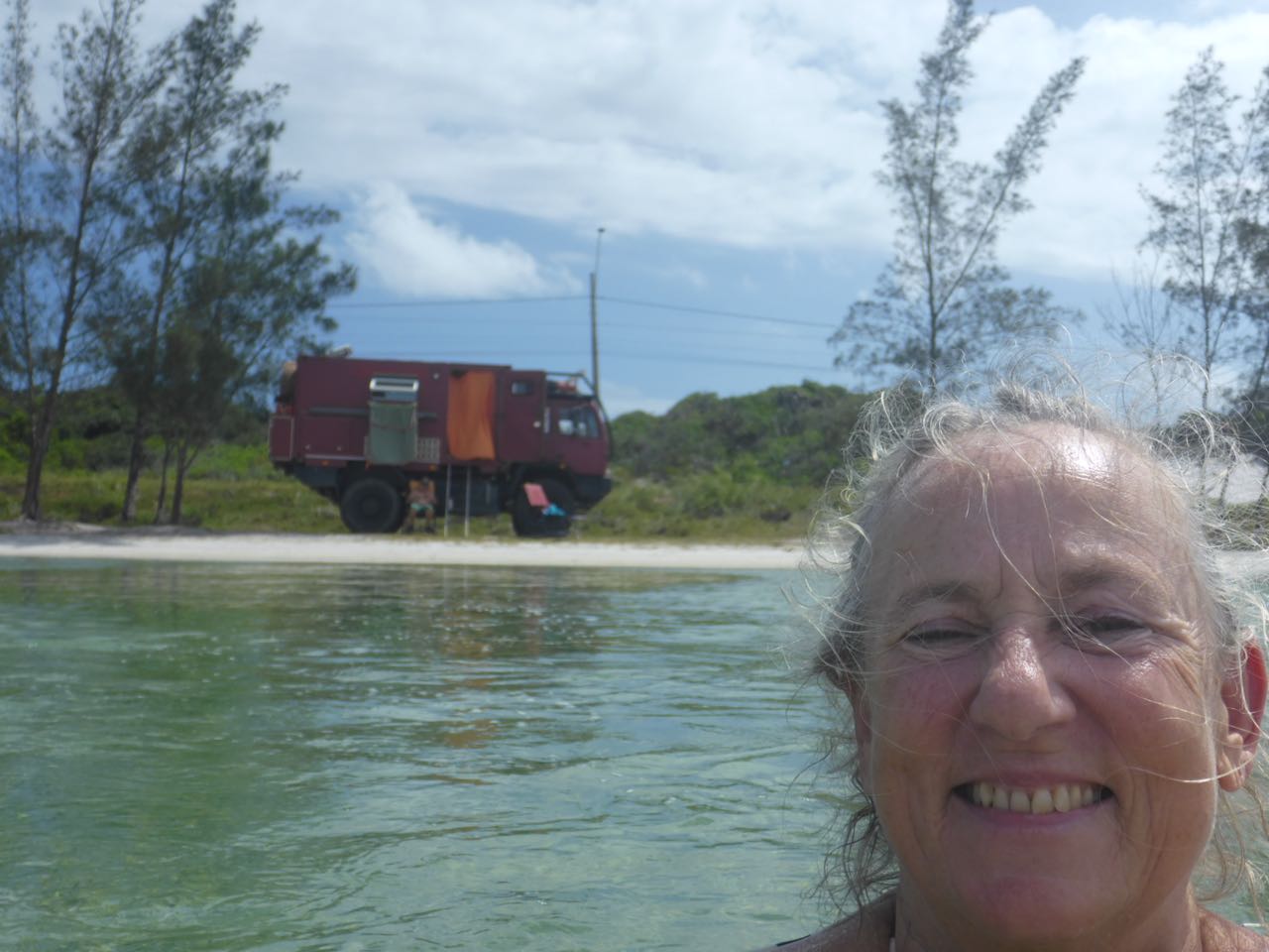 Unser Sonnenschirm hält dem Wind nicht stand, zum Glück haben wir gute Sonnenmilch.