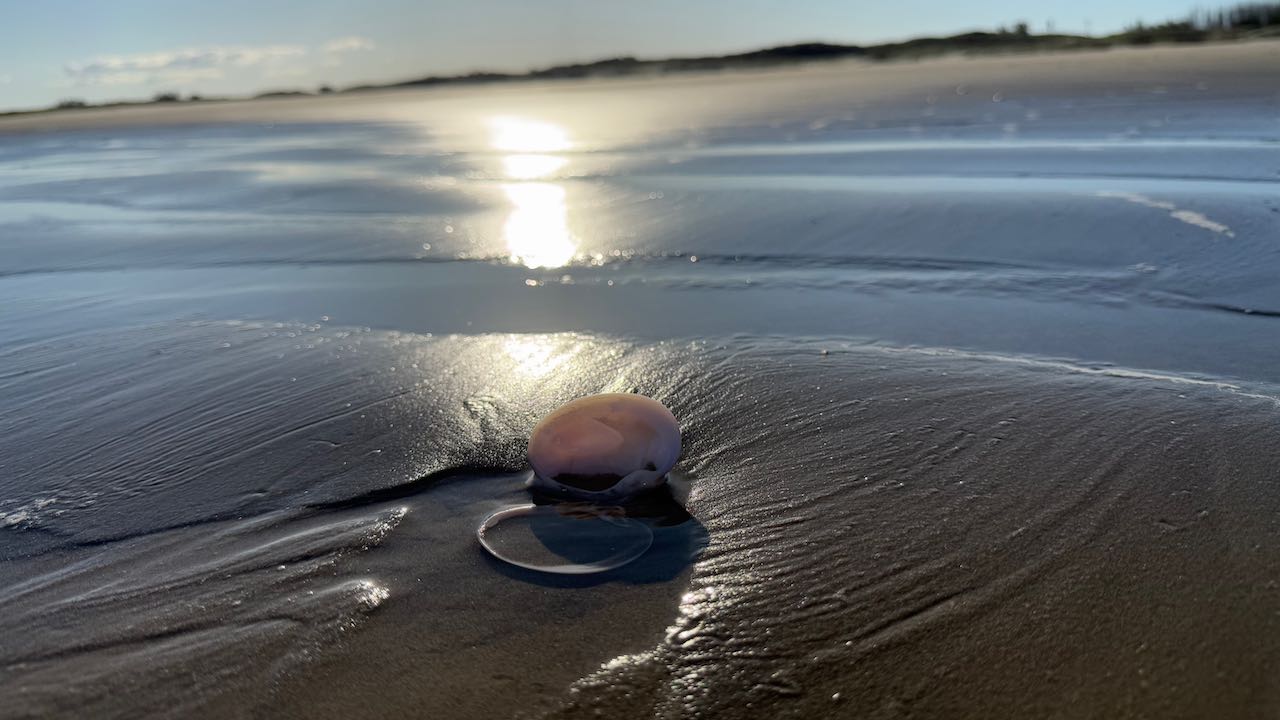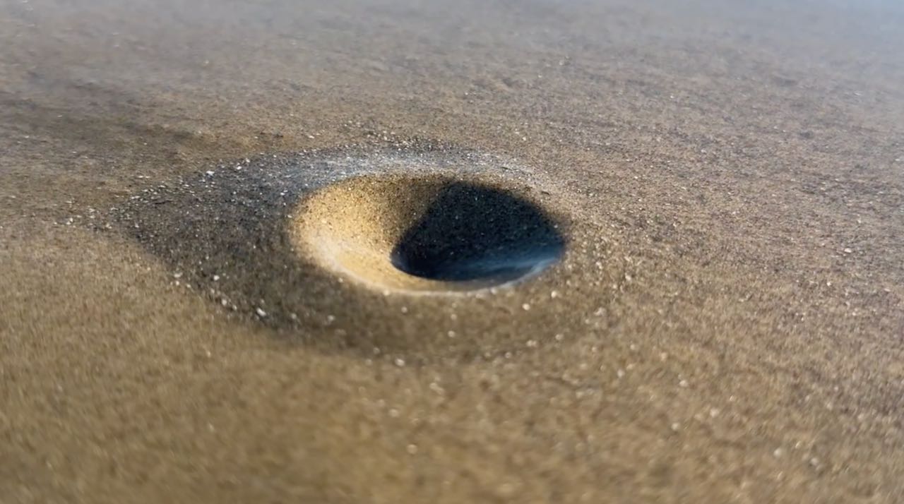 Wenn sich die Wellen zurückziehen, entstehen kleine Löcher, es blubbert, dann wird Wasser rausgespuckt
