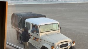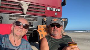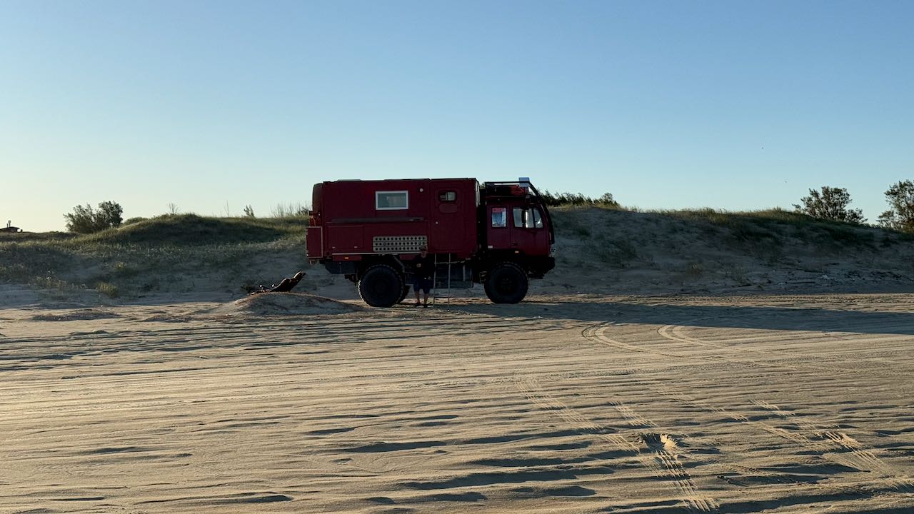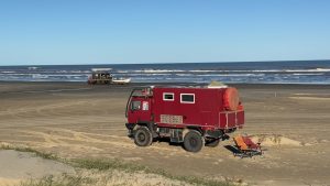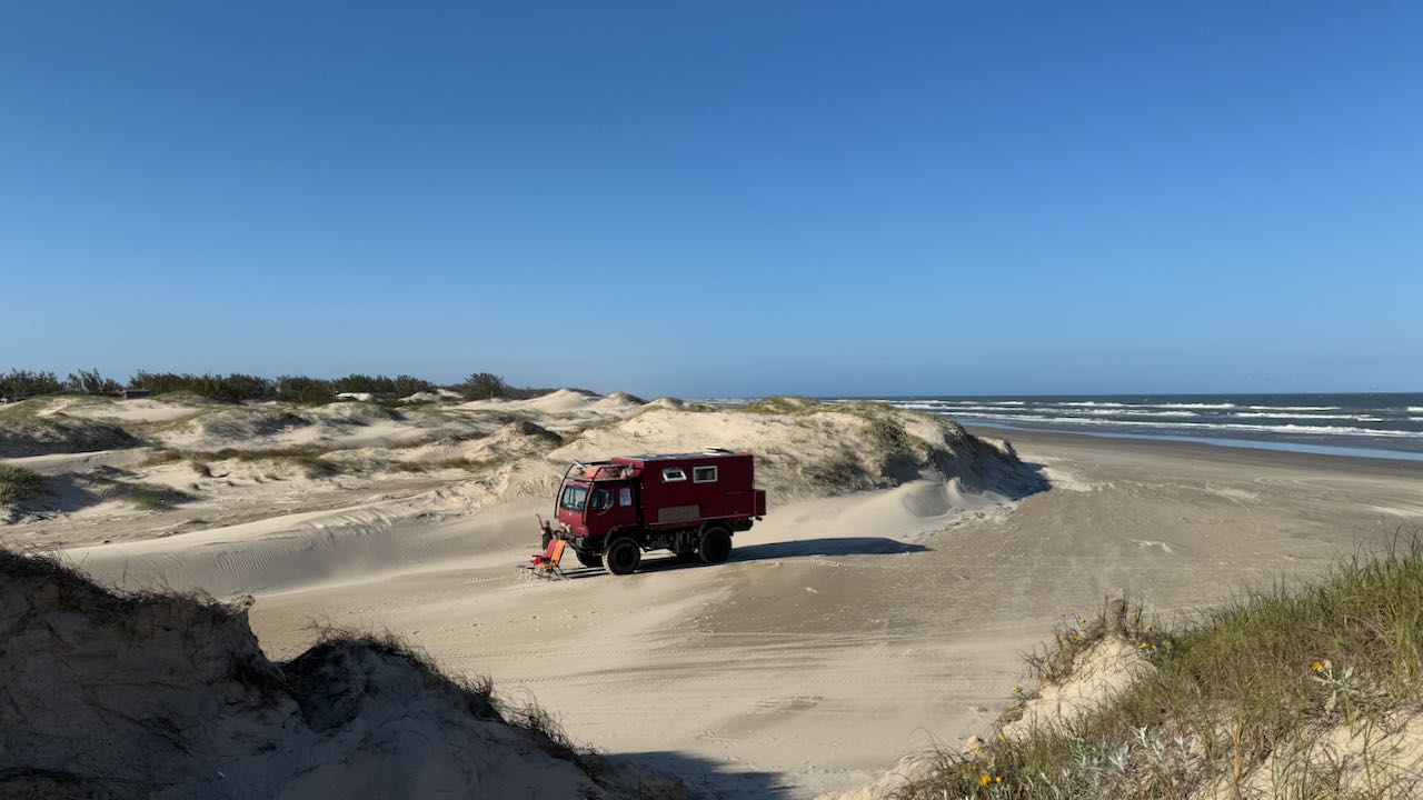 Am Strand düst ein brasilianisches Wohnmobil vorbei, top ausgerüstet