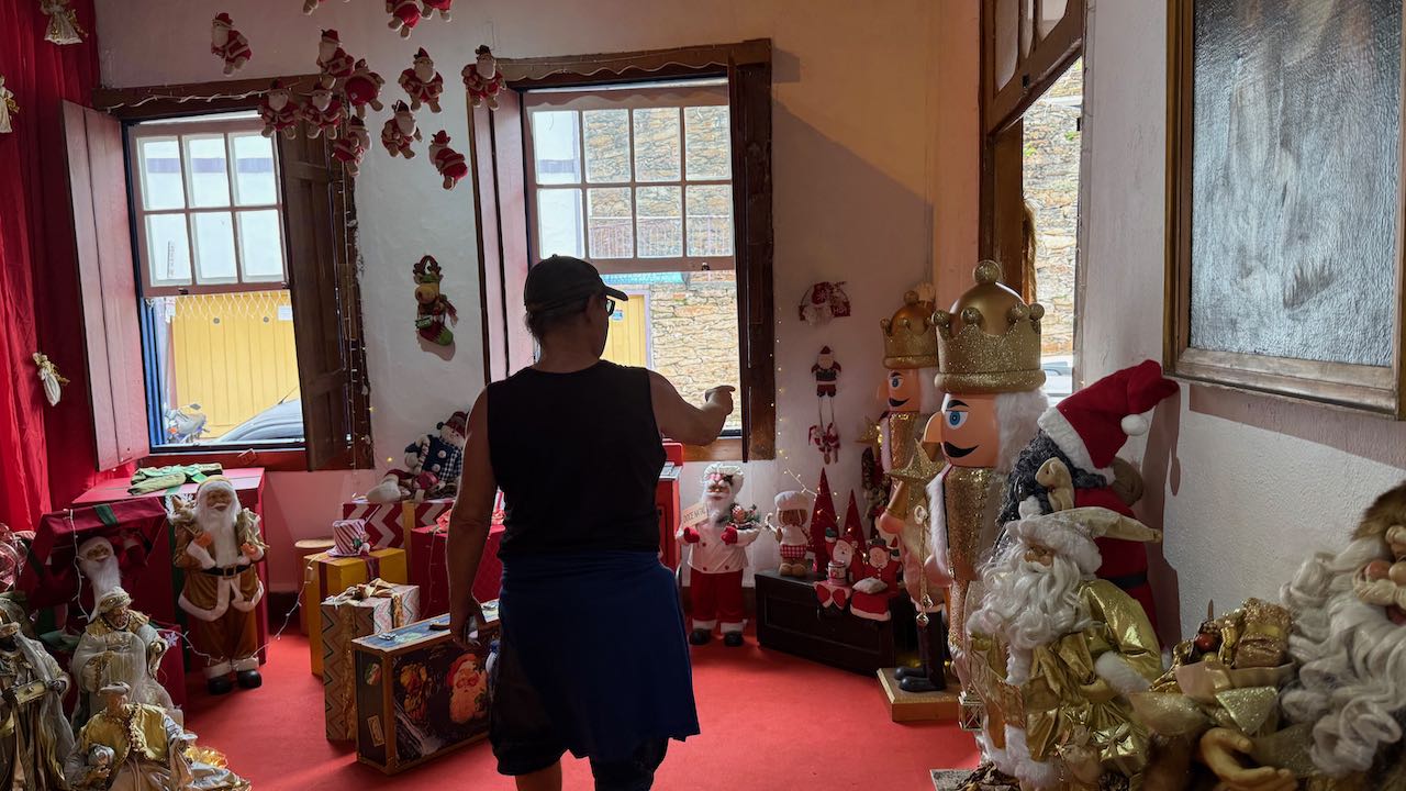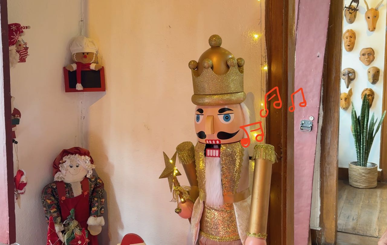 Neben der Tür klappern große Nußknacker mit den Kiefern ein Weihnachtslied. „🎶 Feliz Navidad🎶“…….