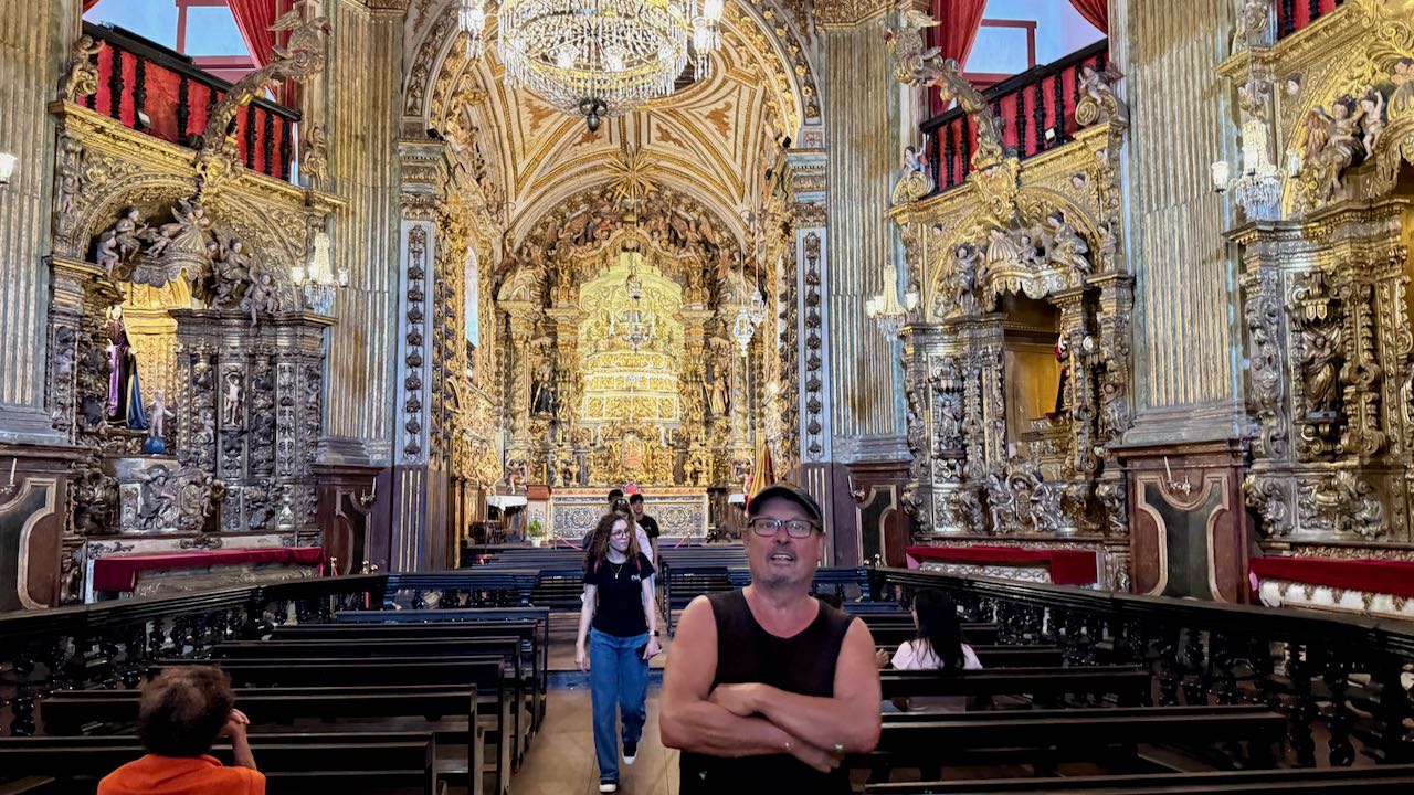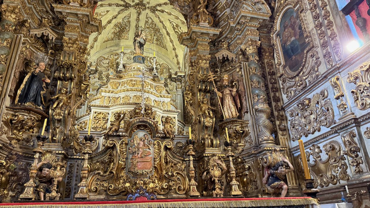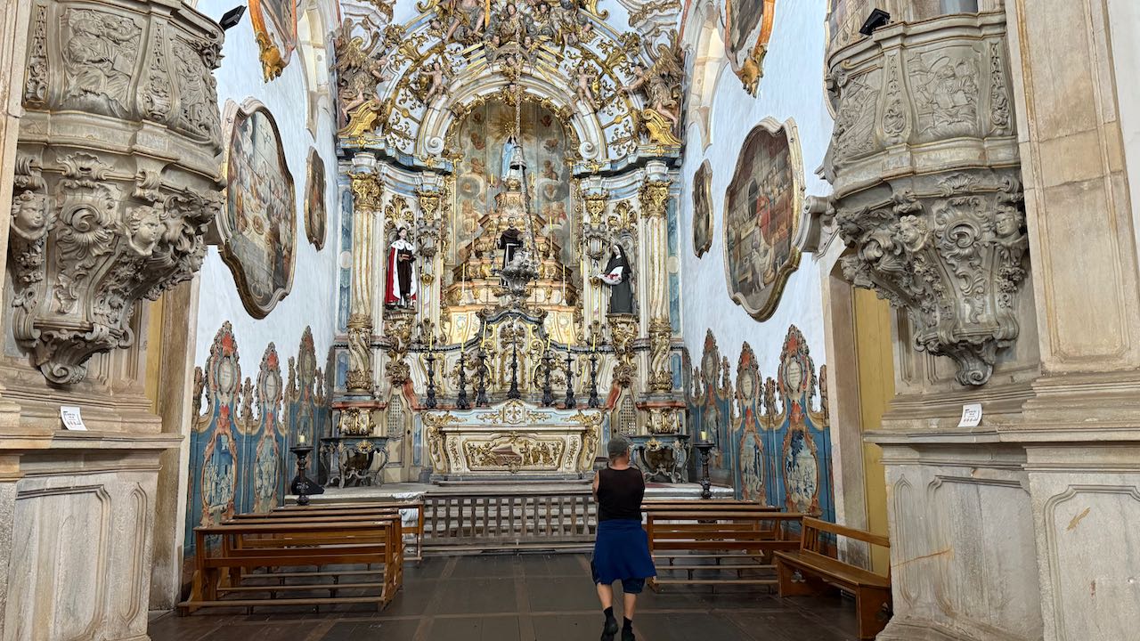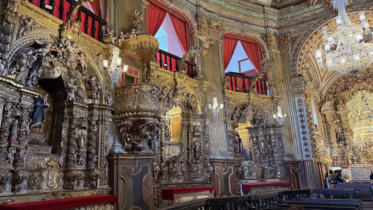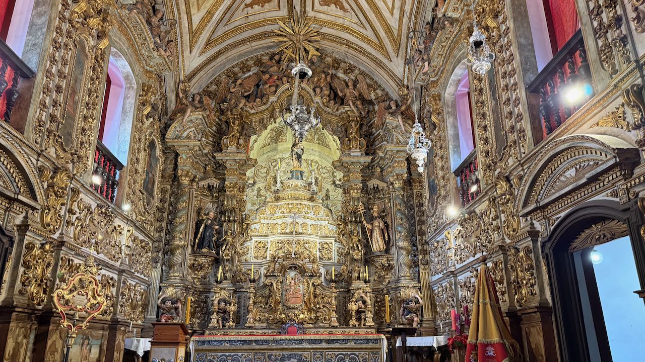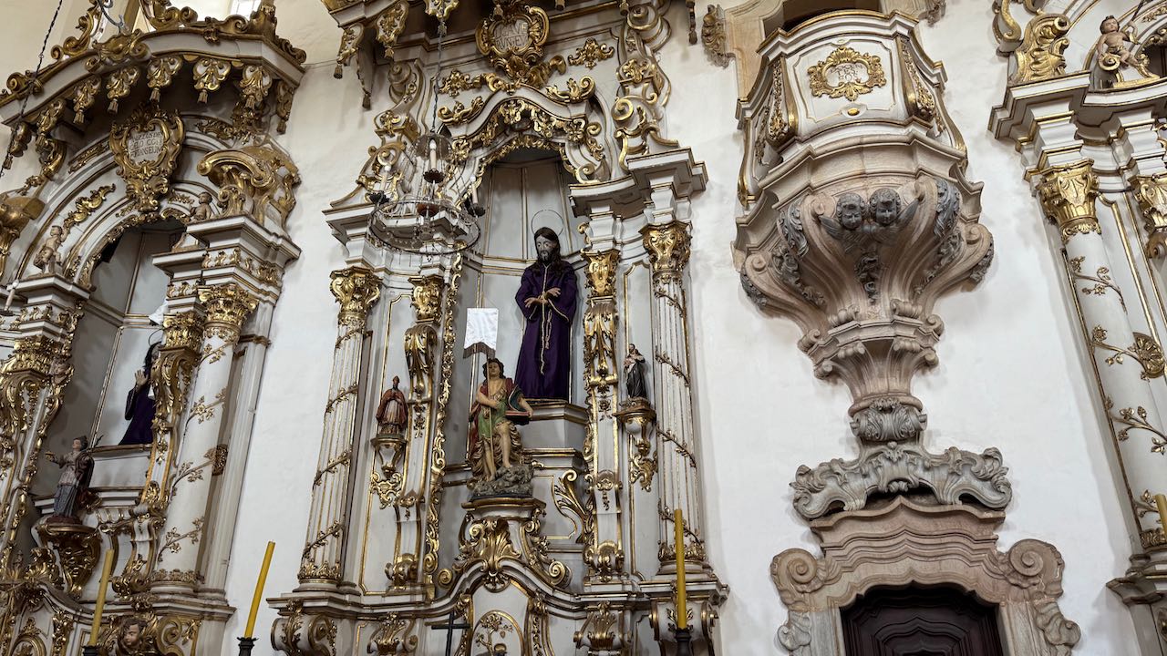 Hinter der Tür Glanz und Glimmer, Schnörkel und Dekoration auf jedem Millimeter. Brasilianischer Barock in Reinform.