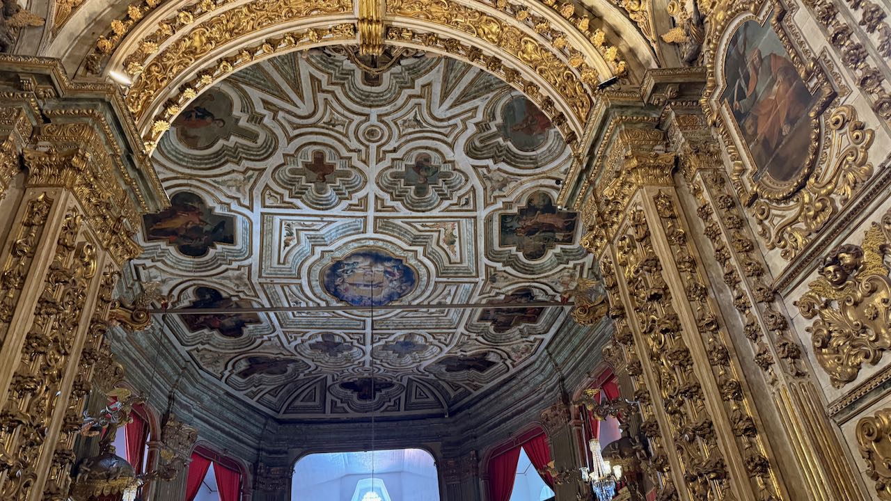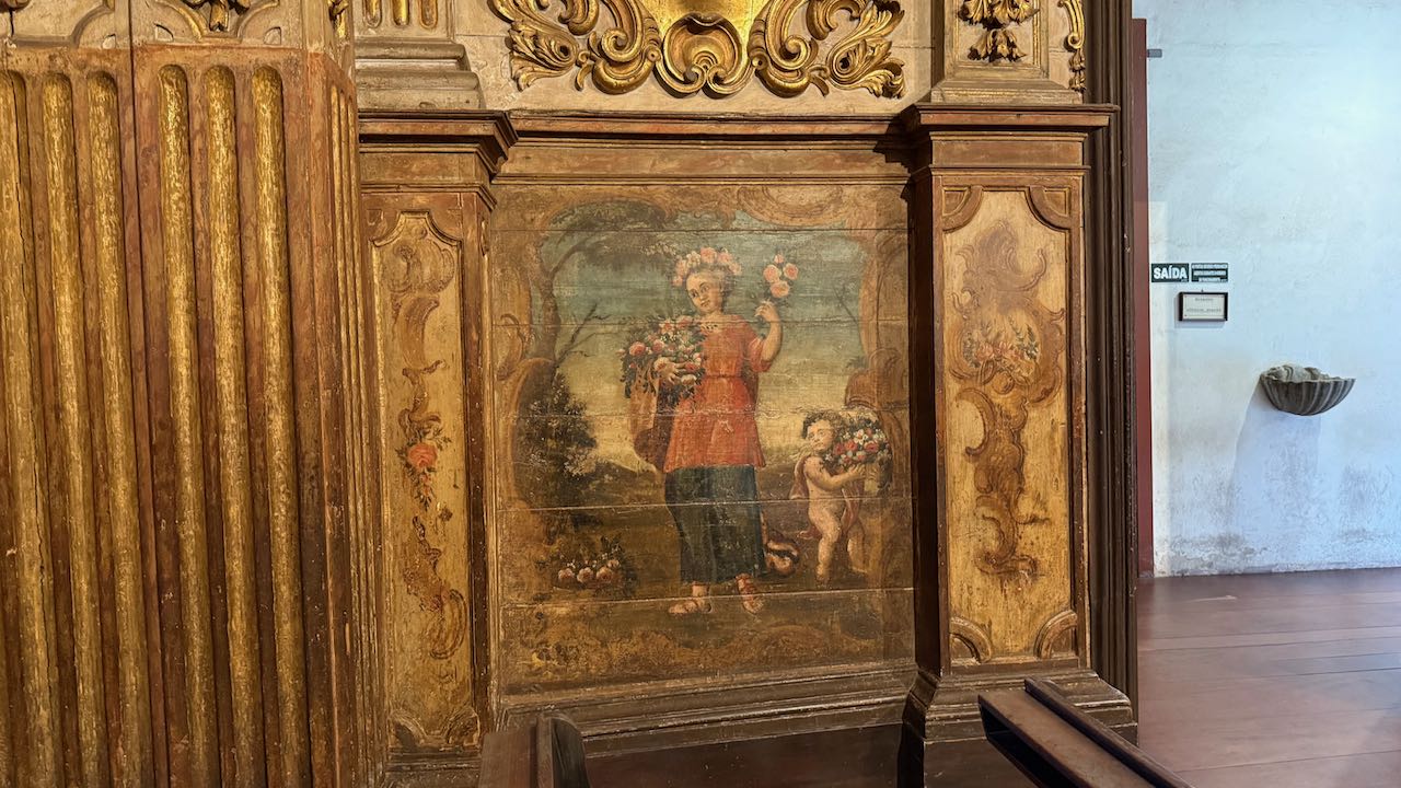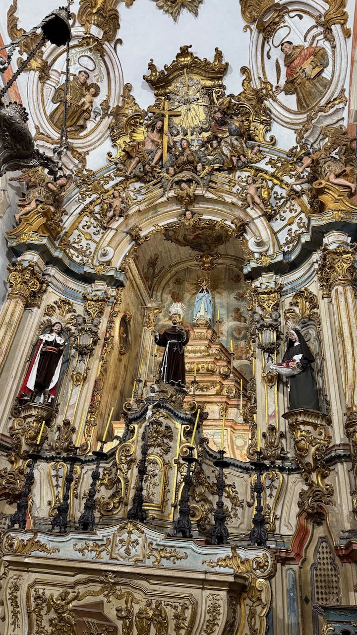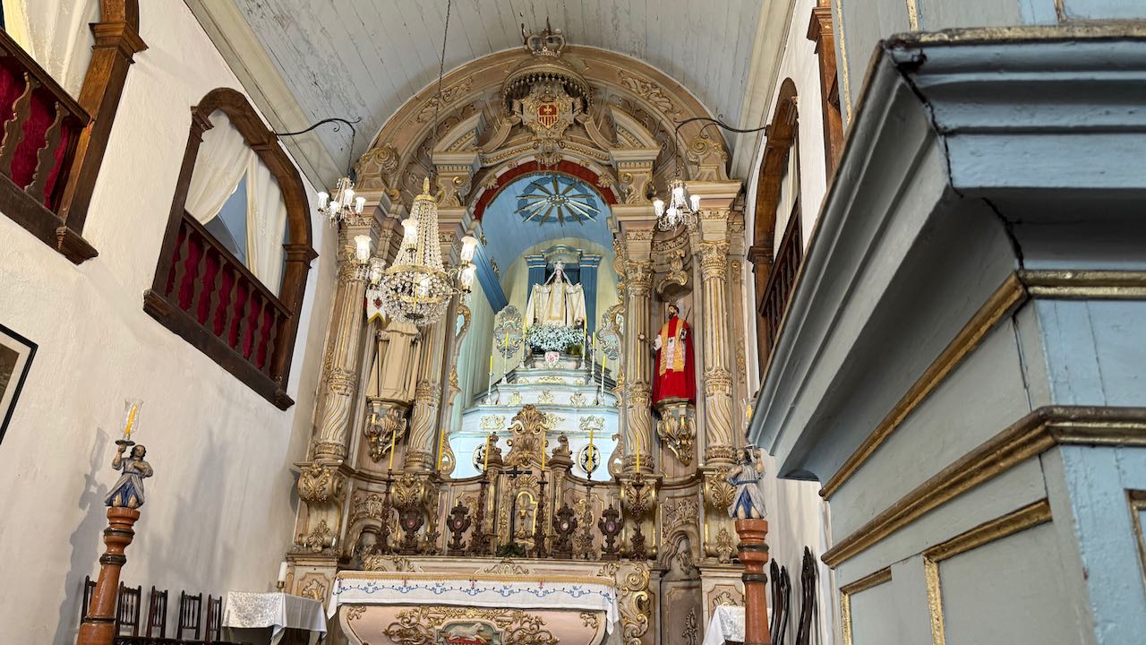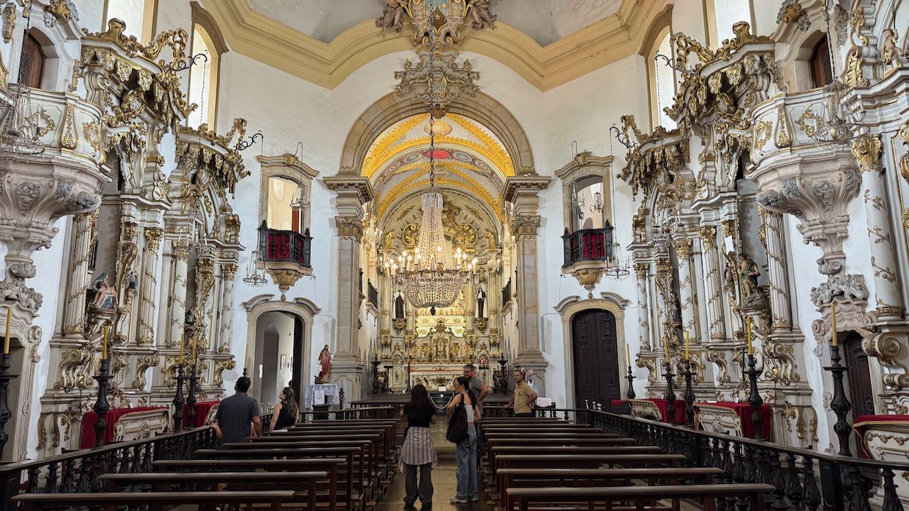 Hinter der Tür Glanz und Glimmer, Schnörkel und Dekoration auf jedem Millimeter. Brasilianischer Barock in Reinform.