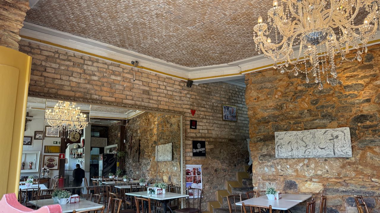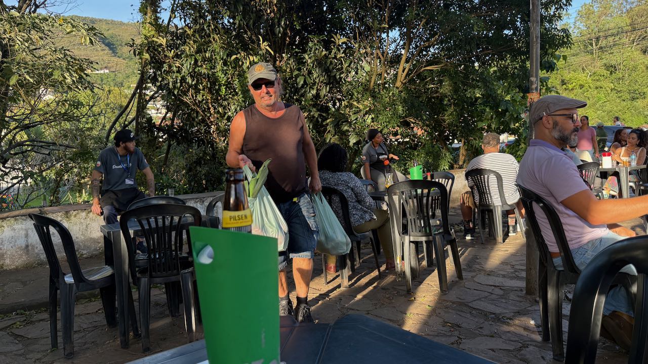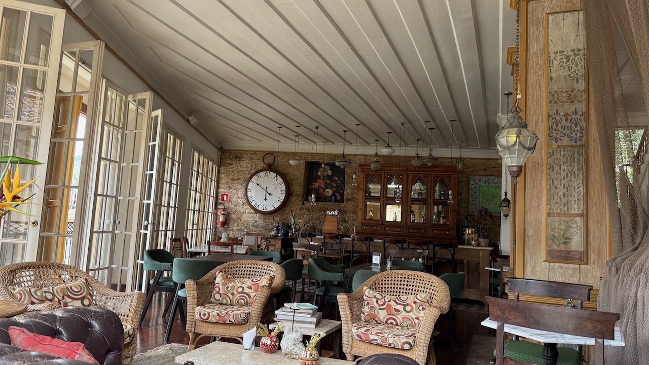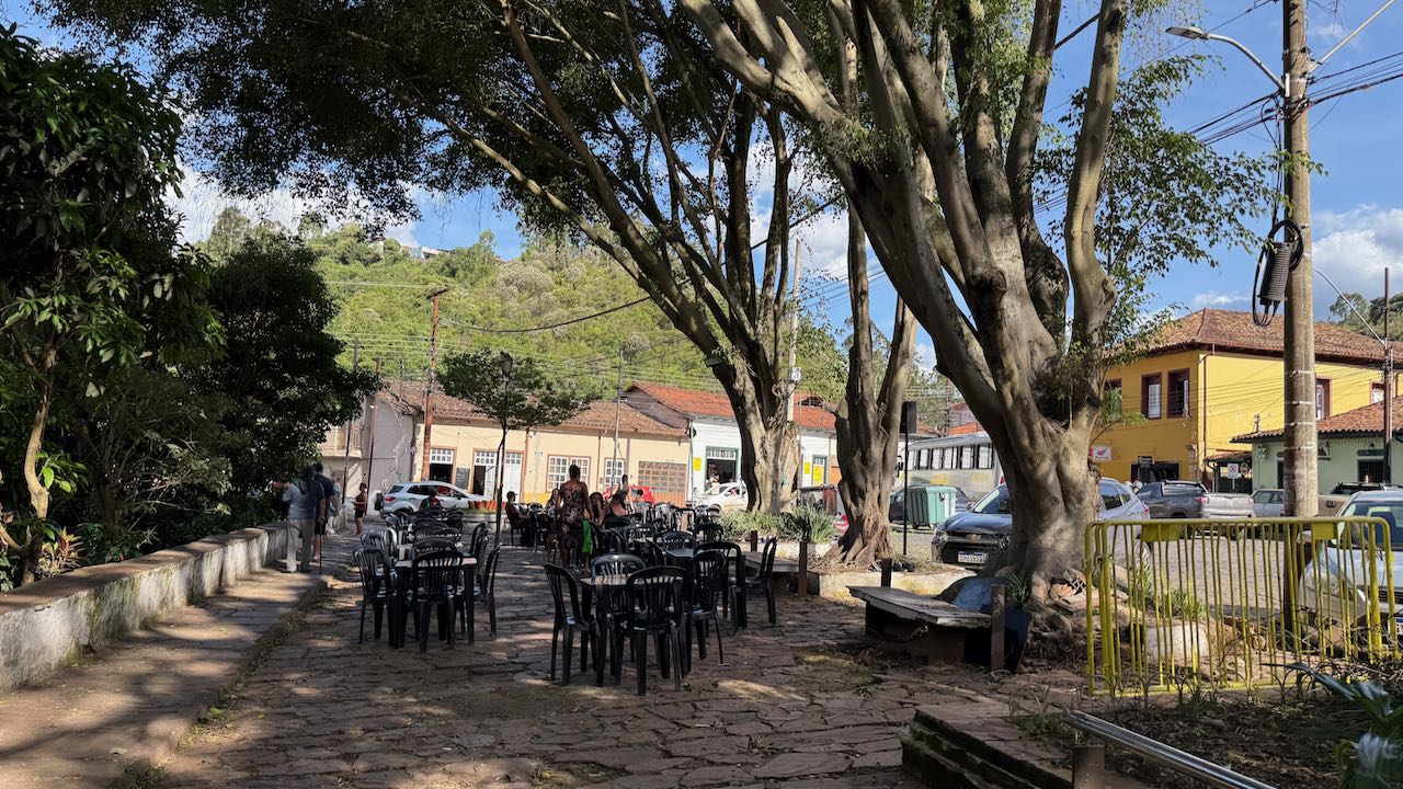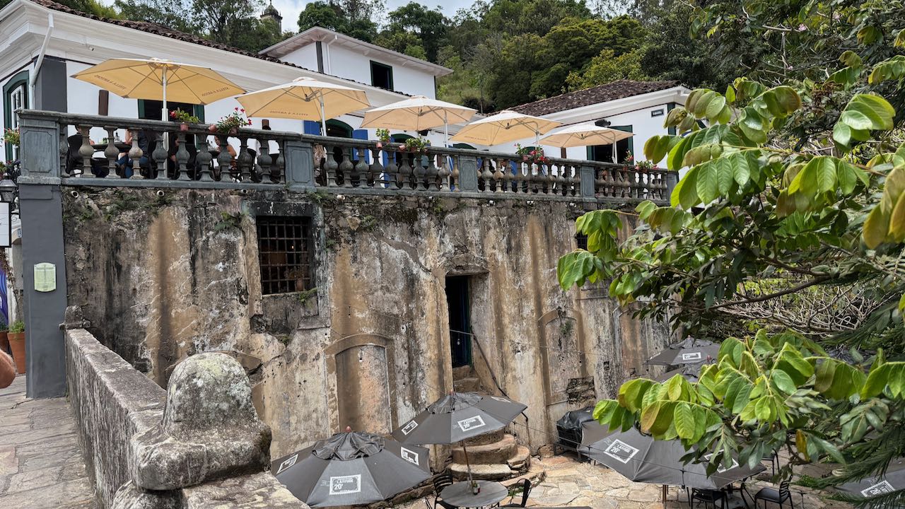 Zum Café gehört ein kleiner Garten, mit einem Schälchen Kekse und einem Glas der berühmte Chocolate de Ouro Preto wird die Mittagspause angenehm überbrückt.