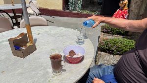 Vor der Bar do Glacio sind die Kellner noch mit Stuhl- und Tischaufbau beschäftigt, die Wartezeit überbrücken wir auf einer schattigen Bank mit einem Getränk aus dem Supermercado.