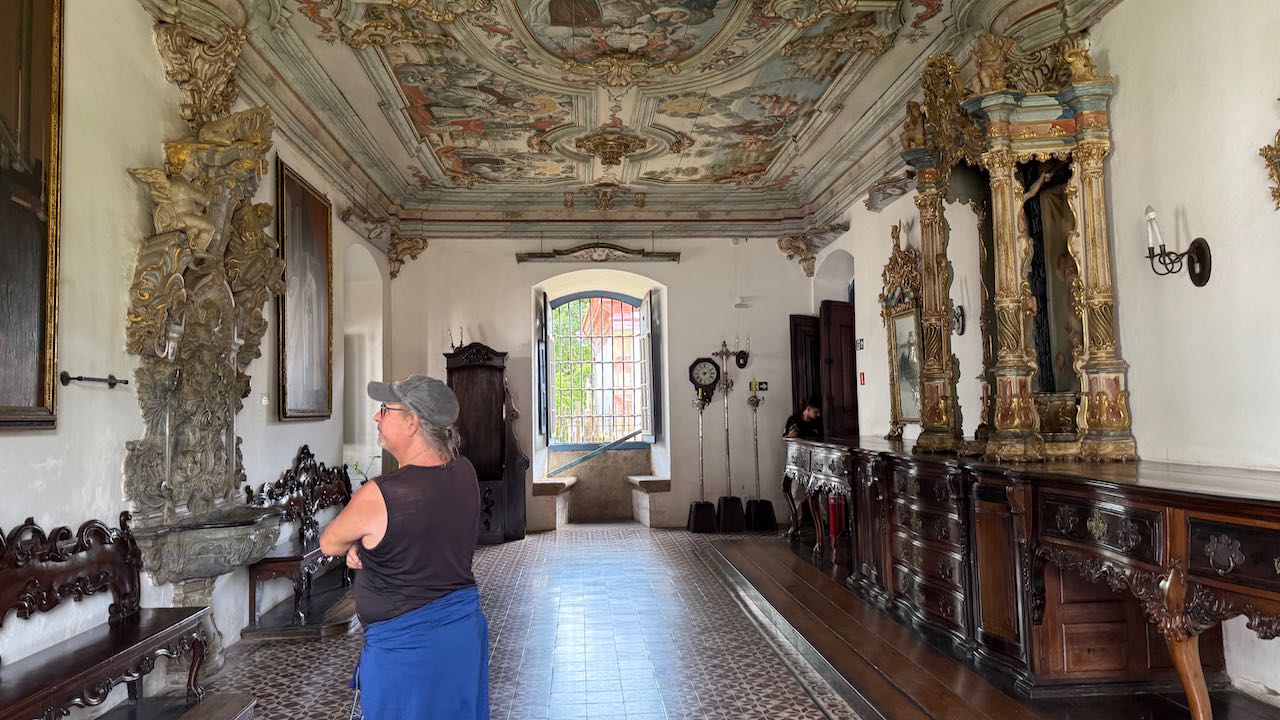 Eine Treppe führt uns wieder hinauf zur Kirche Sao Francisco, hat er das gemeint? Irgendwo in den Hinterräumen der Kirche?