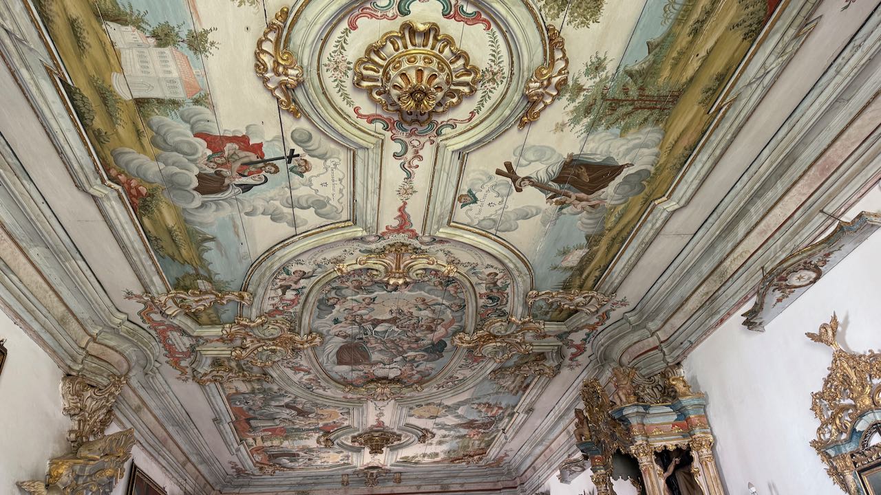 Die Decke in himmelblau, gemalt von einem italienischen Künstler, wirkt wie eine freundliche Einladung in den Himmel.