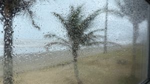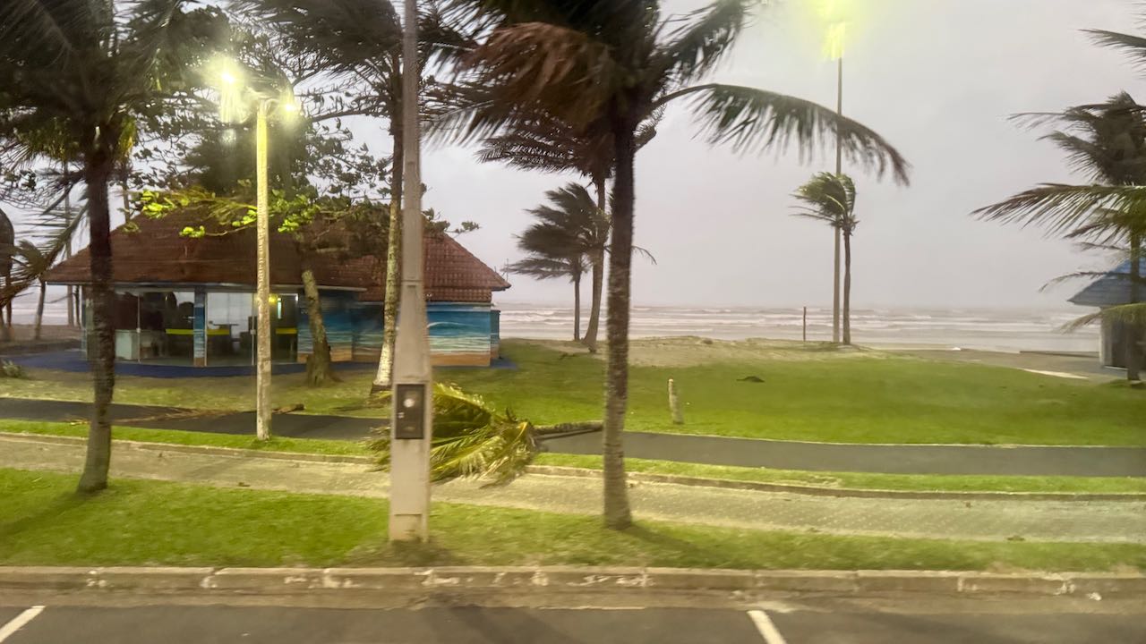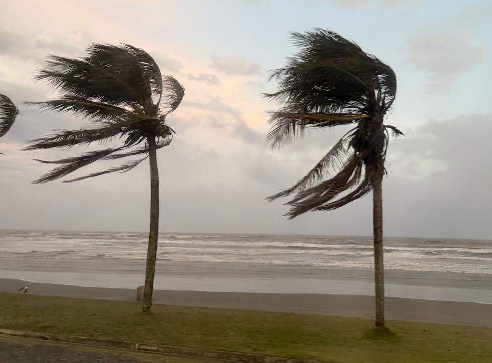 Wir verdrücken uns in eine Seitengasse, gerade noch rechtzeitig. Hier stehen wir geschützter, hören dem Pfeifen des Windes zu und sehen durch eine Häuserlücke, wie die Regenschleier waagerecht die Promenade runterpeitschen, wie sich die Palmen biegen. Echt heftig!