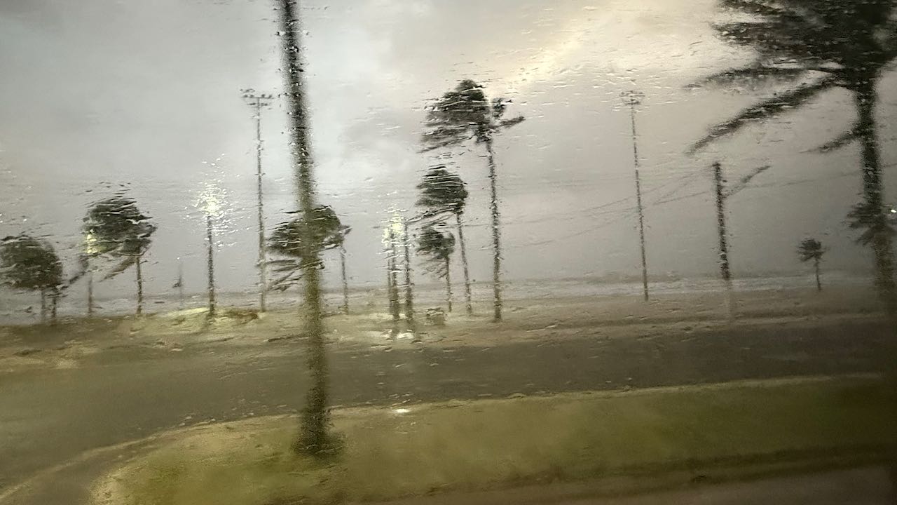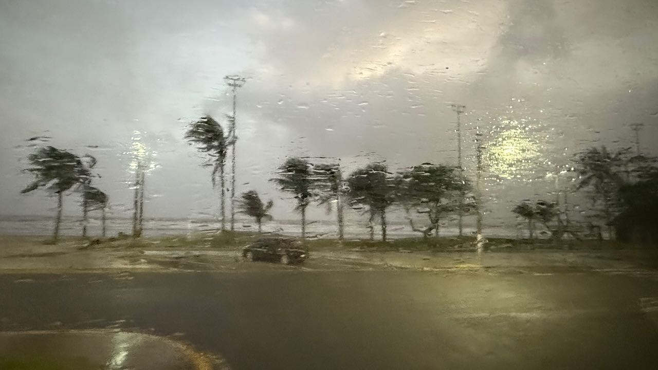 Die Wellen schäumen, über den Boden kullern Kokosnüsse, Palmwedel fliegen herum, eine kleine Palme ist abgebrochen.