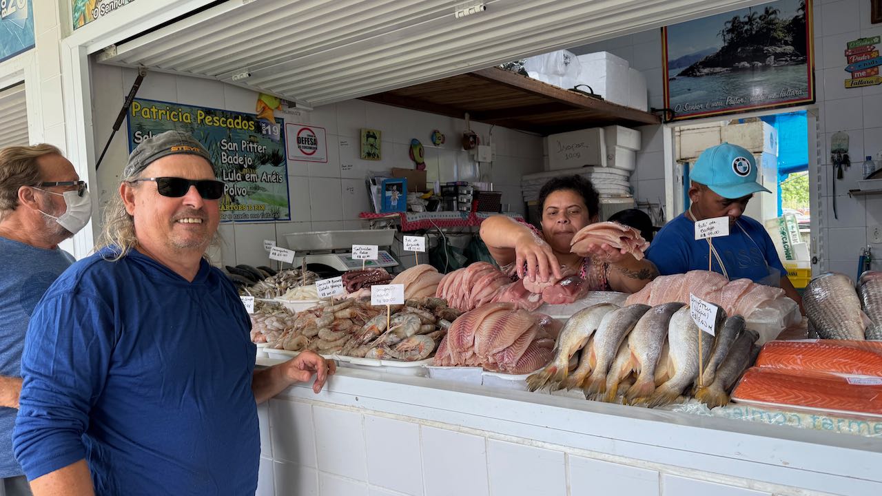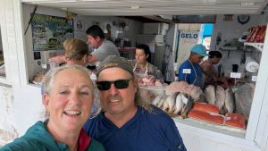 Diesmal holen wir Fisch bei Patricia, der Name steht groß über ihrem Marktstand. Wie freundlich und fröhlich immer alle sind, wir werden so nett bedient, einfach schön.