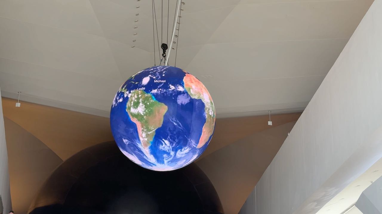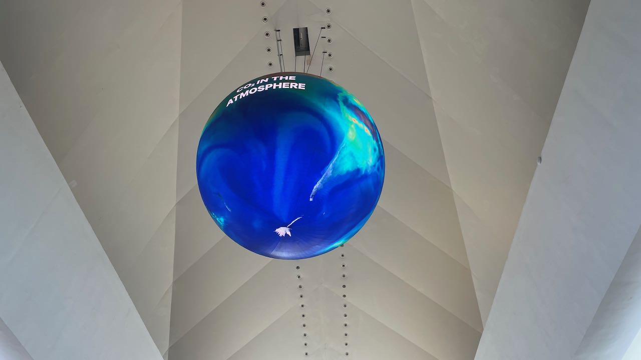 Unter der Decke hängt eine vier Meter große Weltkugel, die verschiedene Erdprozesse wie Meeresströmungen, CO2 Gehalt, aktuelle Hoch-und Tiefdruckgebiete in Echtzeit anzeigt.