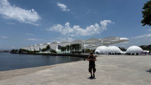 An der Seite steht das MAR, das Museu do Arte Rio. Zwei Gebäude, alt und neu, verbunden durch ein gewelltes Sonnendach.