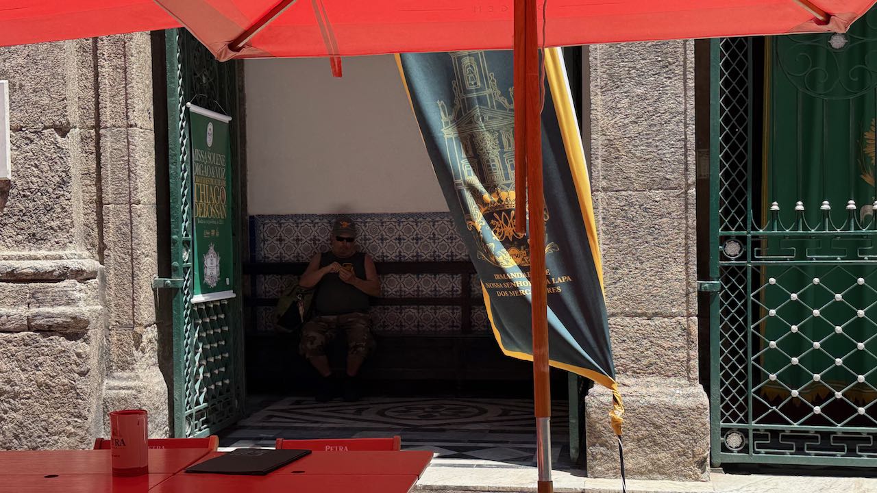 Wir erholen uns ein wenig von der Hitze auf einer Schattenbank im Eingang einer kleinen Kapelle.