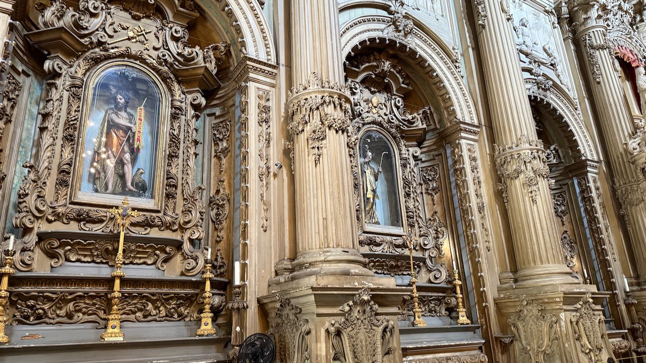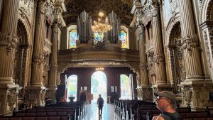 Schon etwas erschöpft von unserem Rundgang bietet uns die Kirche einen Moment der Ruhe und Kühle. Der Raum ist für unseren Geschmack völlig überladen mit Steinmetzschnörkeleien. Wo immer es geht, noch ein Schnörkelchen, noch eine Verzierung mehr.