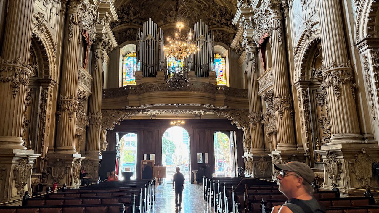 Ringsum eingezwängt von breiten Strassen steht die Igreja de Nossa Senhora da Candelaria, die als eine der schönsten von Rio gilt. Die Fassade wird als eine der schönsten der Welt gepriesen ( nun, Ansichtssache….) Innen ist sie mit herrlichen Wandgemälden ausgeschmückt.