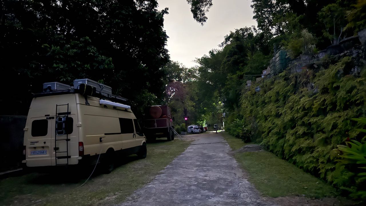 Die Kirche steht versteckt hinter Bäumen, ein hoher Zaun versperrt den Zutritt, wir müssen uns im Klosterbüro anmelden für einen Besuch. Das ist uns zu umständlich und wir möchten auch keine geführte Tour.