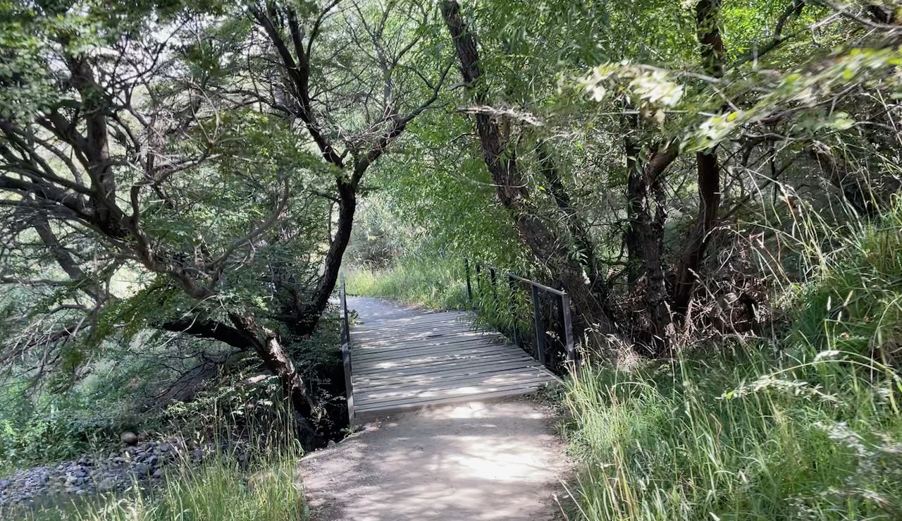 Ein breiter Schotterweg, es geht über ein paar Viehbrücken hinein in ein schattiges Wäldchen