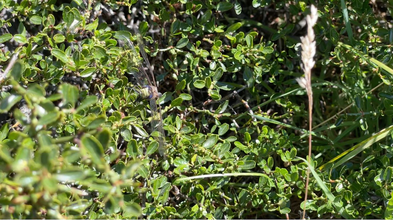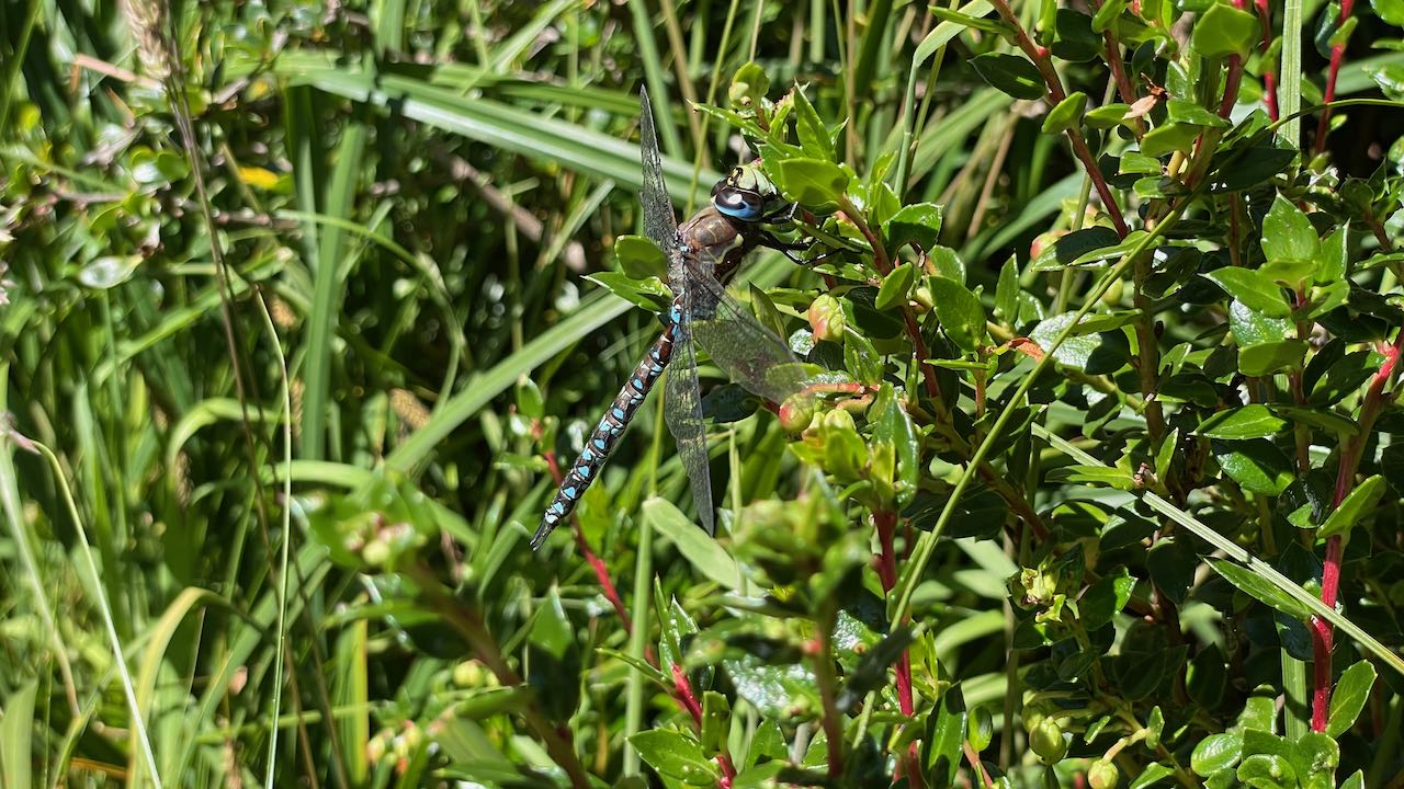 Ich entdecke im Gebüsch eine der farbenfrohen Libellen und sie hält lange genug still. Wunderschön!