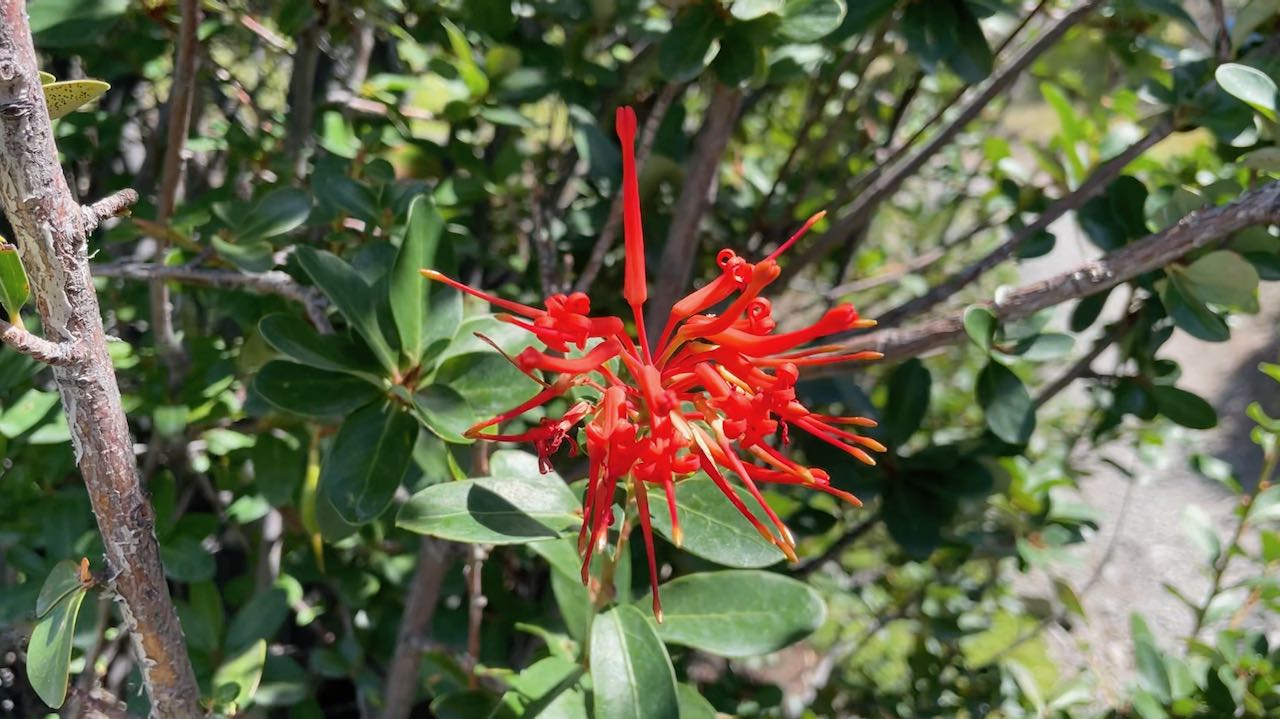 Zwischen dunkelgrünen Blättern knallt uns das Rot des Feuerstrauchs entgegen