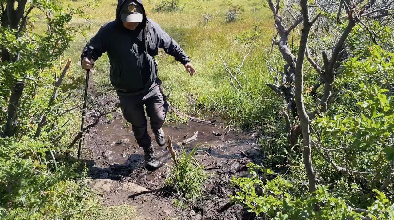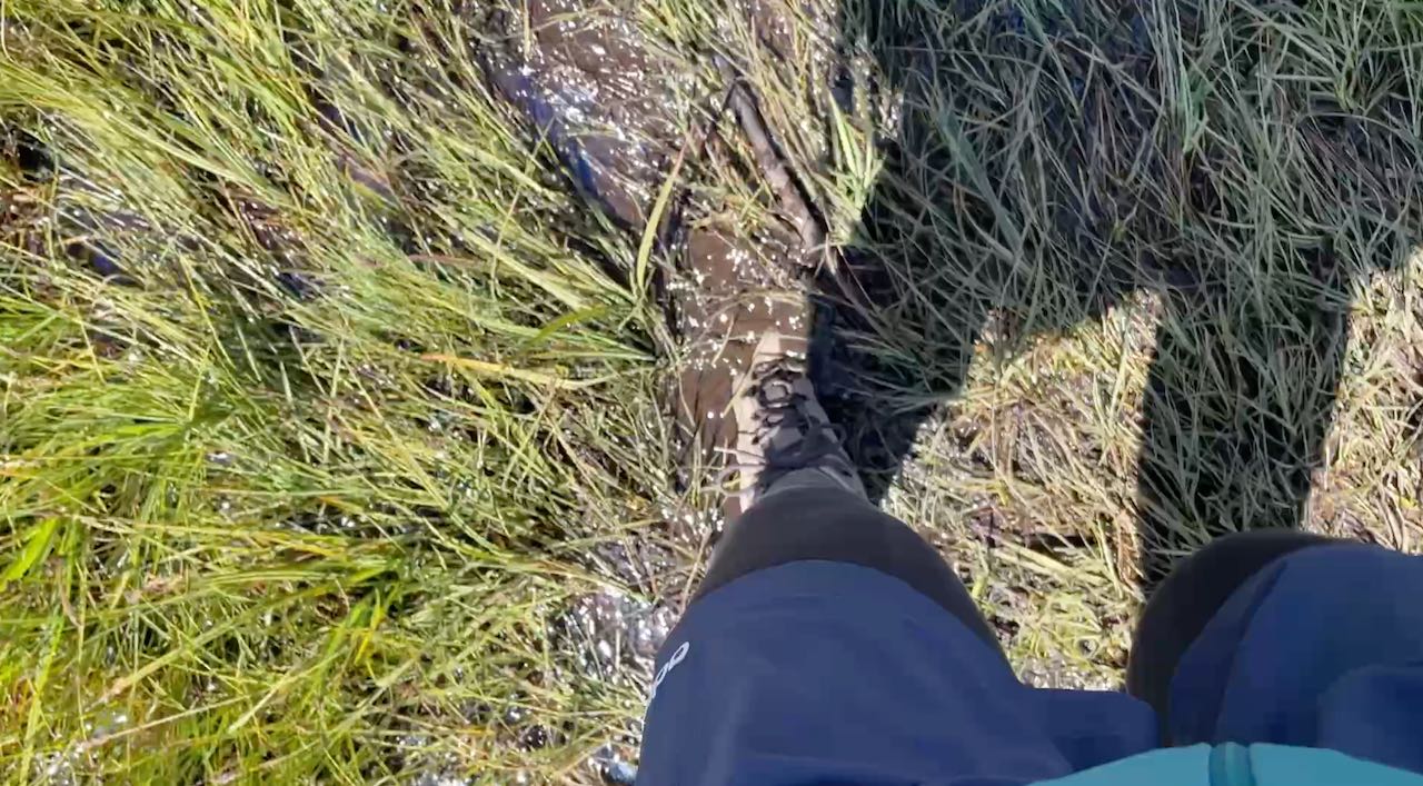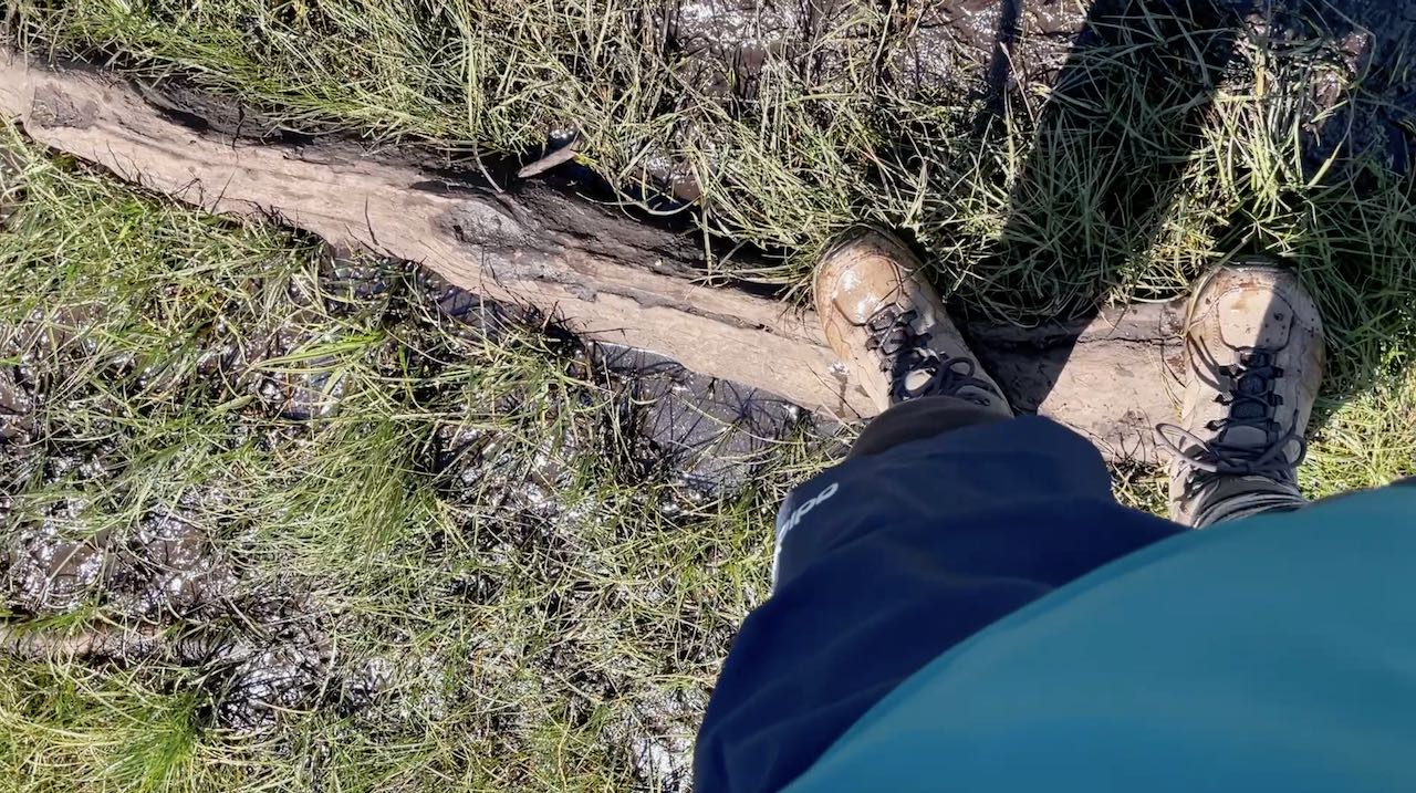 Vielleicht 40 Meter patschen wir durch den Sumpf, sinken teilweise tief ein. Das ist unangenehm, zum Glück haben wir gute Schuhe, die nicht sofort durchsuppen.