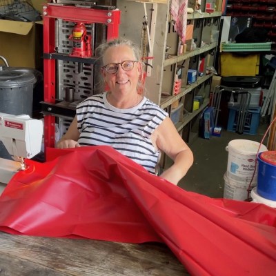 Die bestellte Lkw-Plane ist gekommen. Abends schneiden wir noch 4 Bahnen zu. Das wird unser neuer Faltenbalg. Selbstgemacht diesmal.