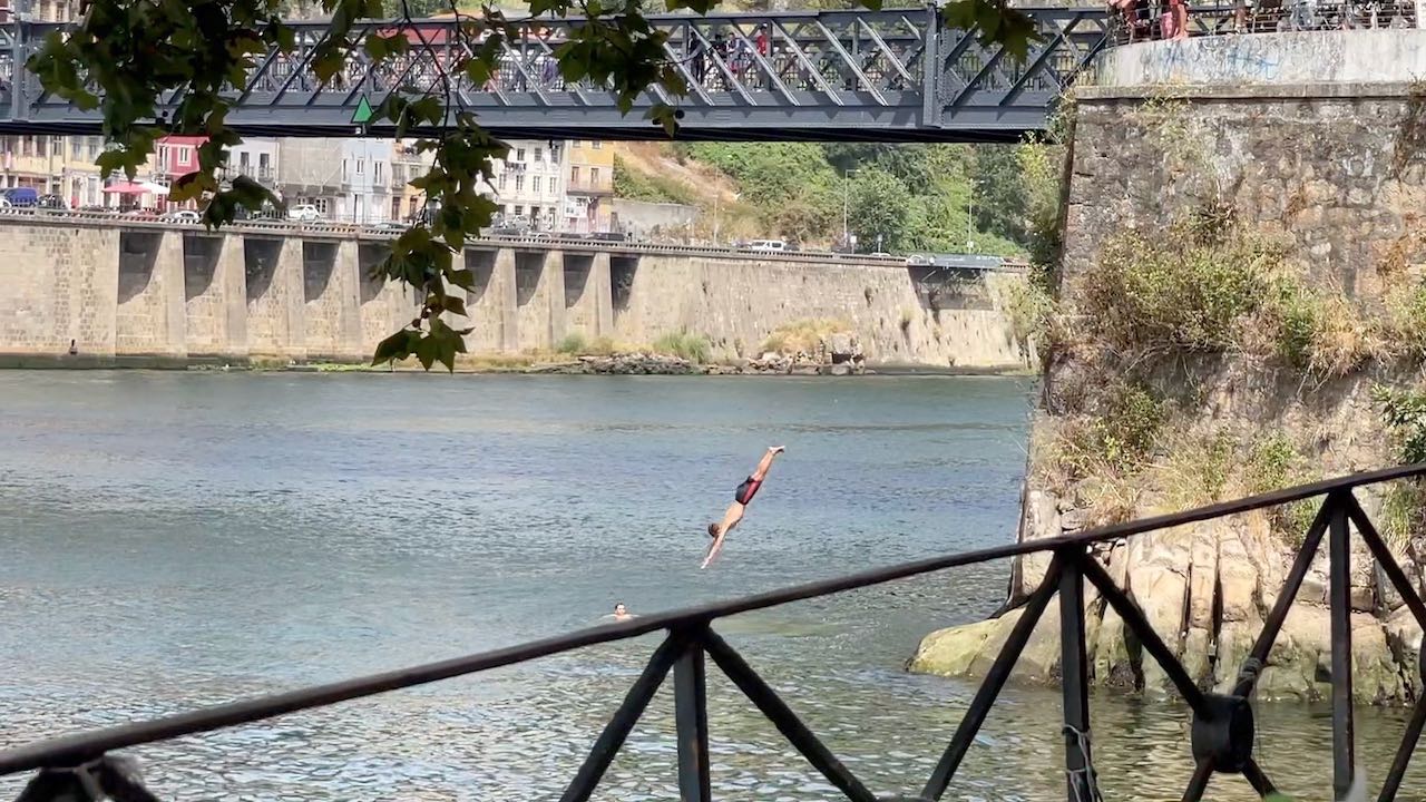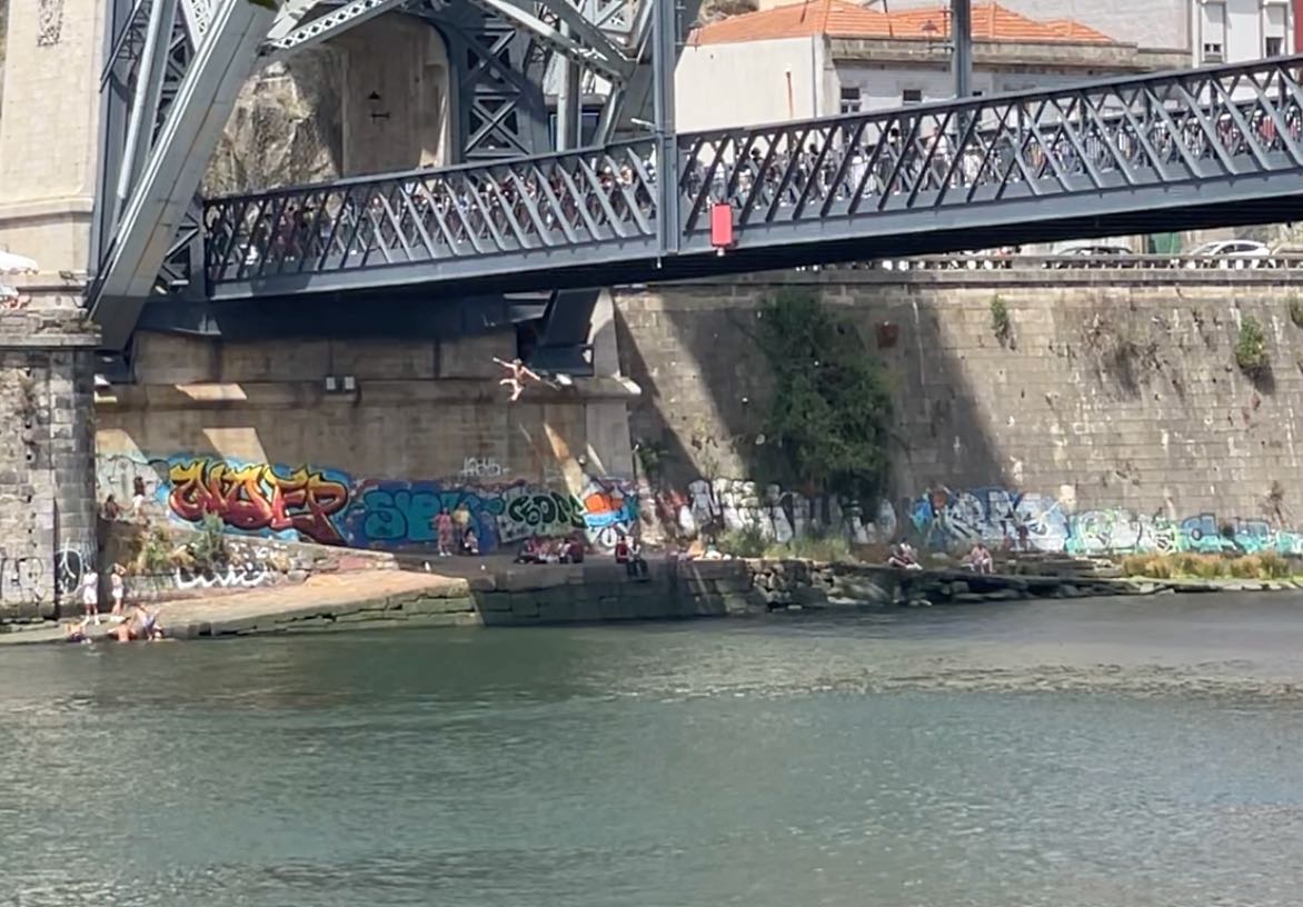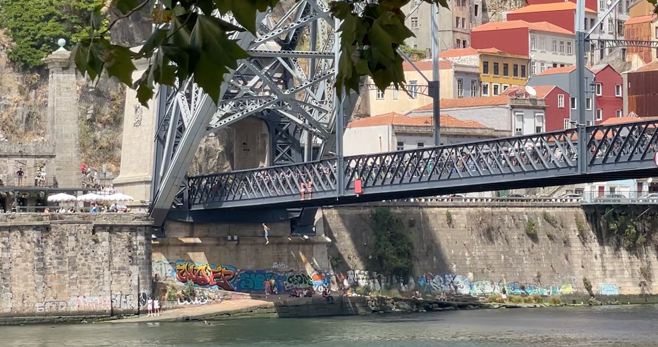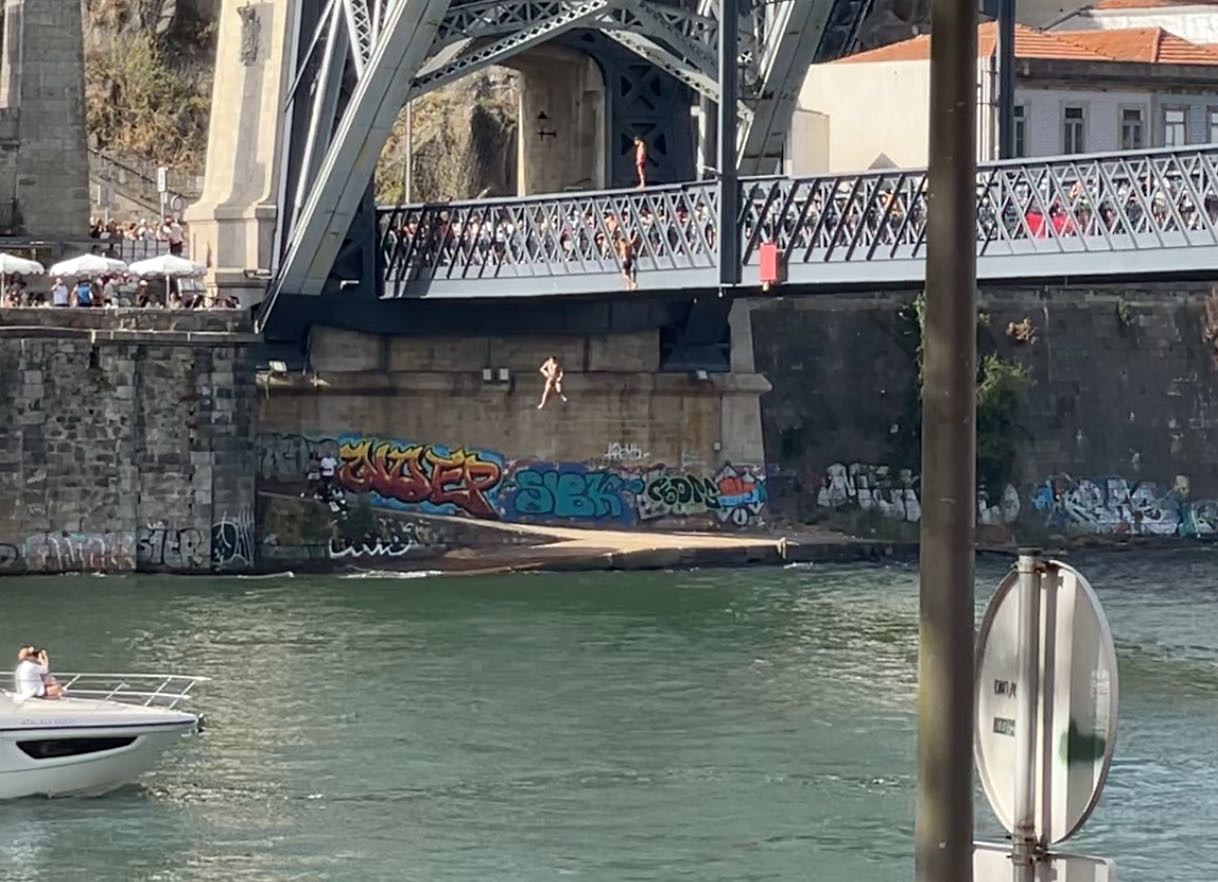 und beobachten von hier aus die Mädels und Jungs, die erst lässig auf dem Brückengeländer rumlungern und dann ihre (über)mutigen Sprünge in den Douro machen.