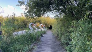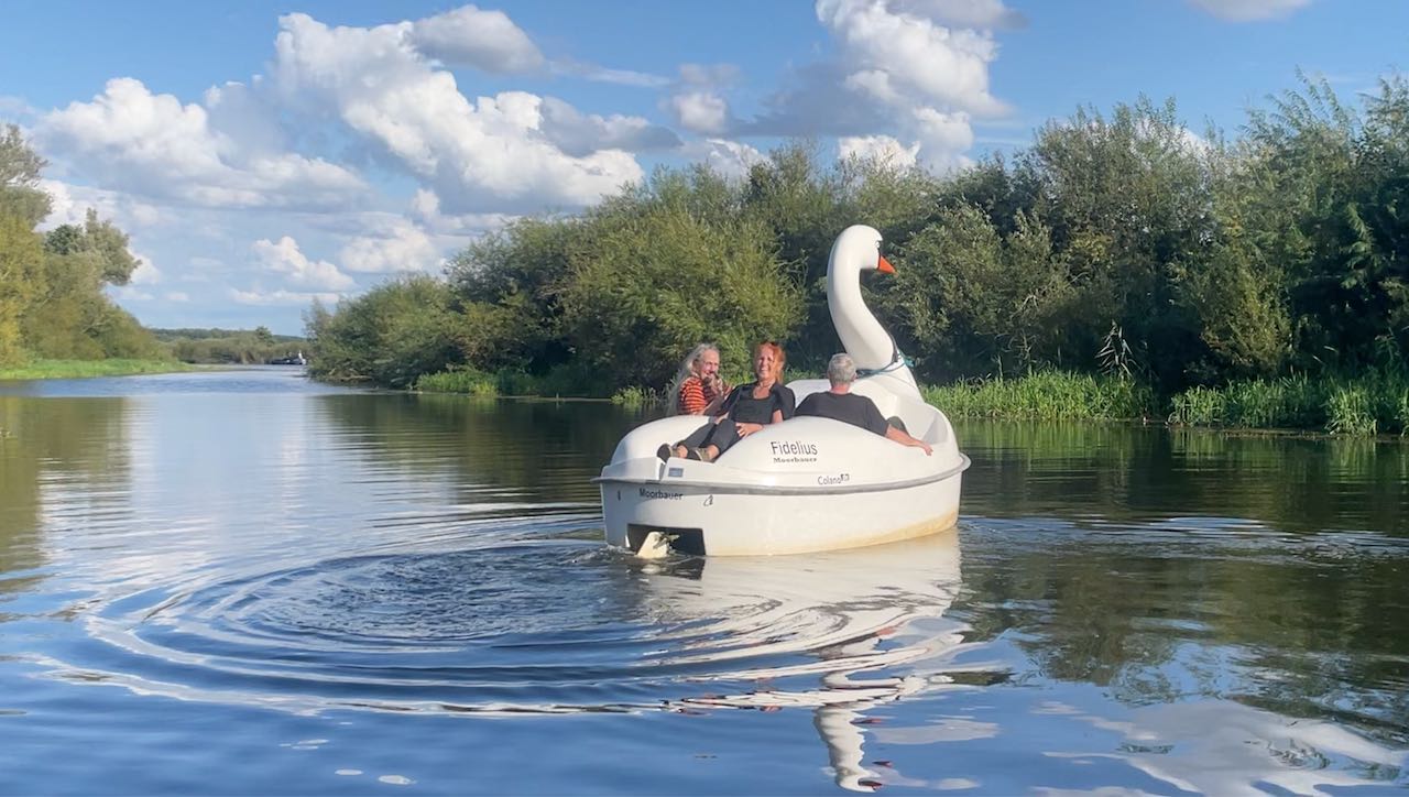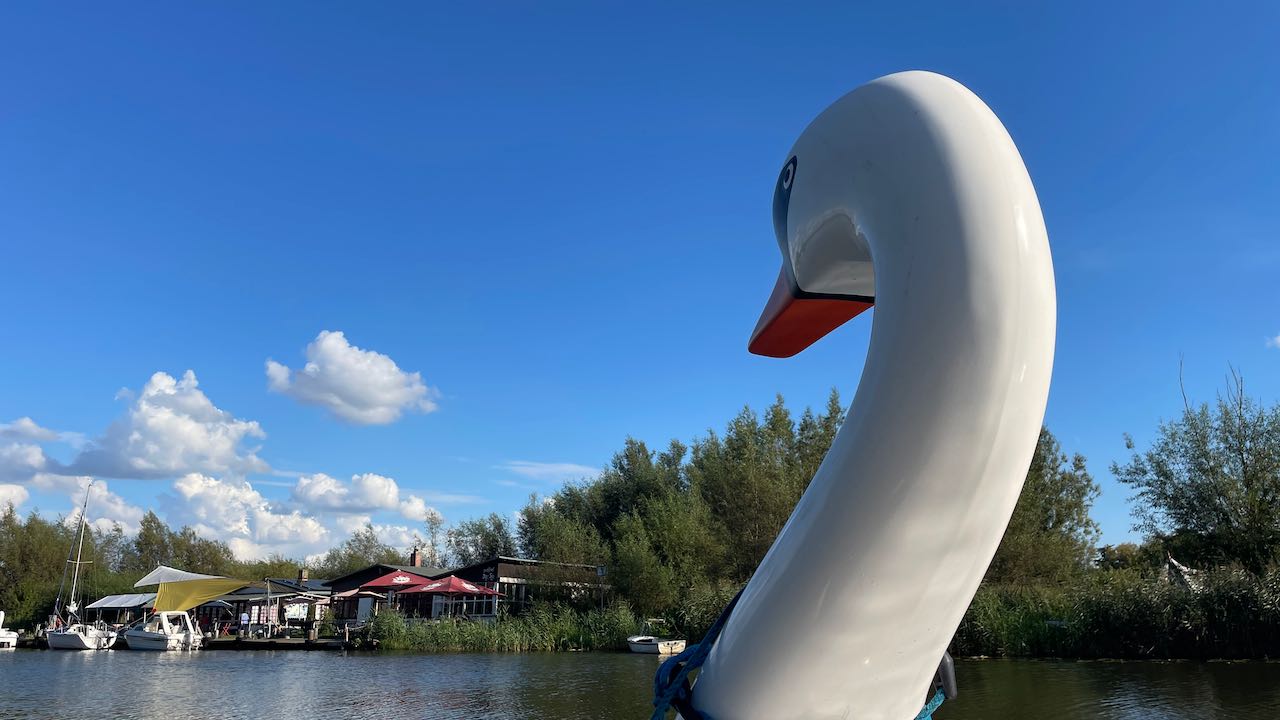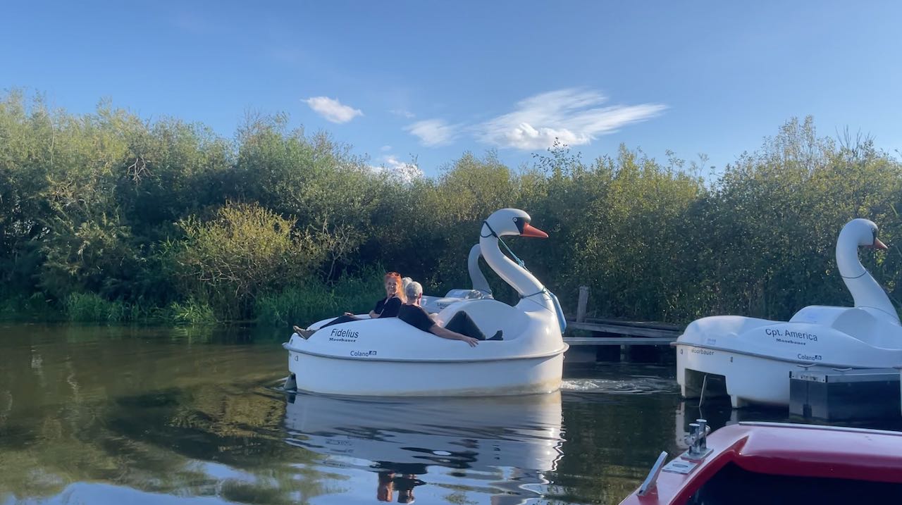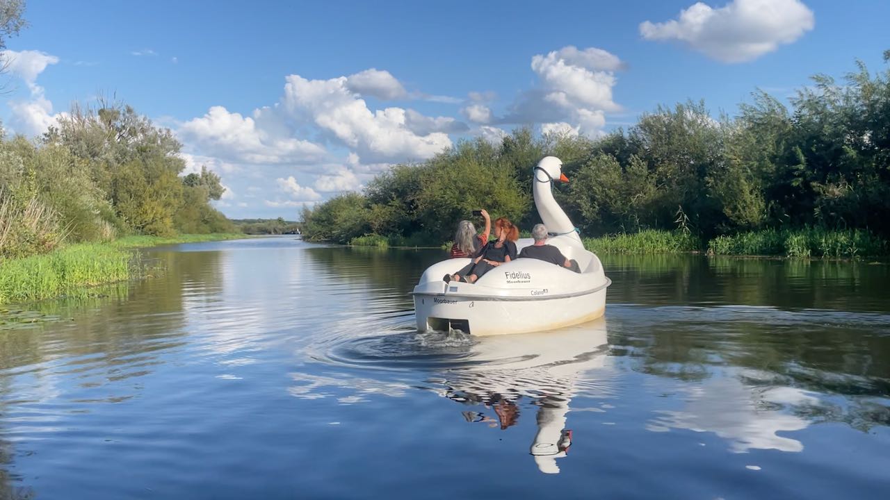 Der Knüller am Moorbauern ist die Fahrt über den See zum Restaurant: mit Schwänen!