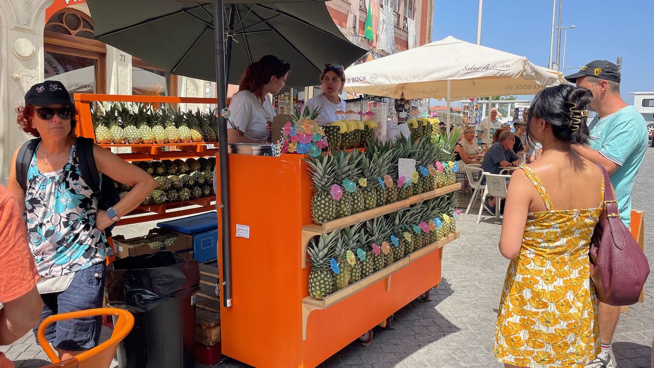 In der Fußgängerzone wird Piña Colada in ausgehöhlter Ananas serviert.
