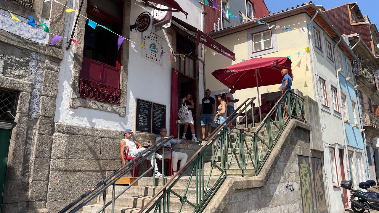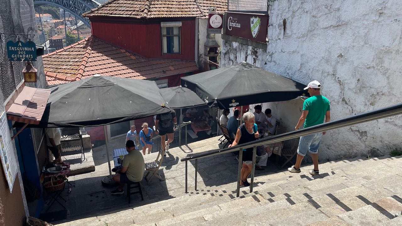 Ein paar Treppenstufen tiefer stehen auf einem Absatz die Tische der Tasquinha dos Guindais