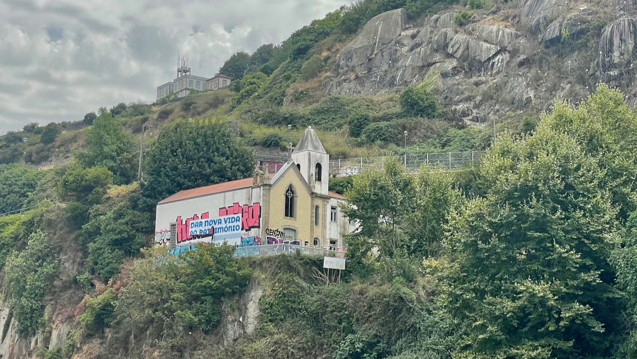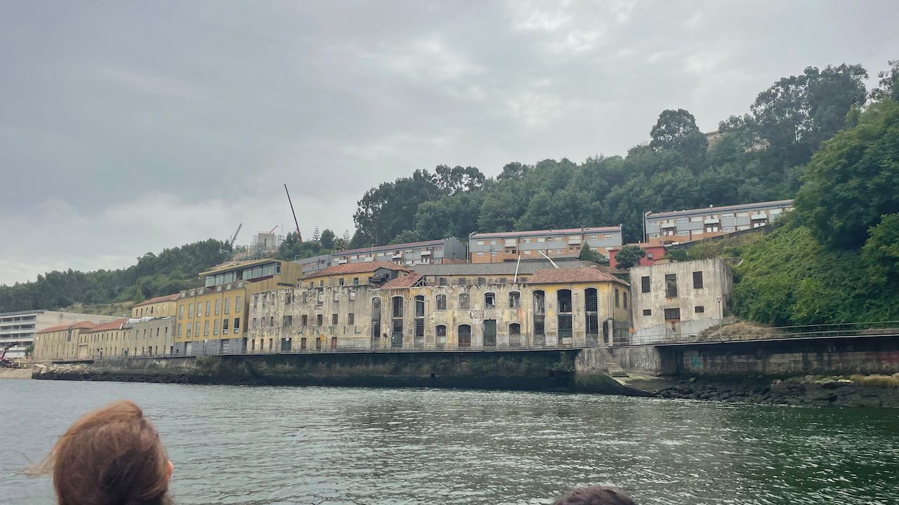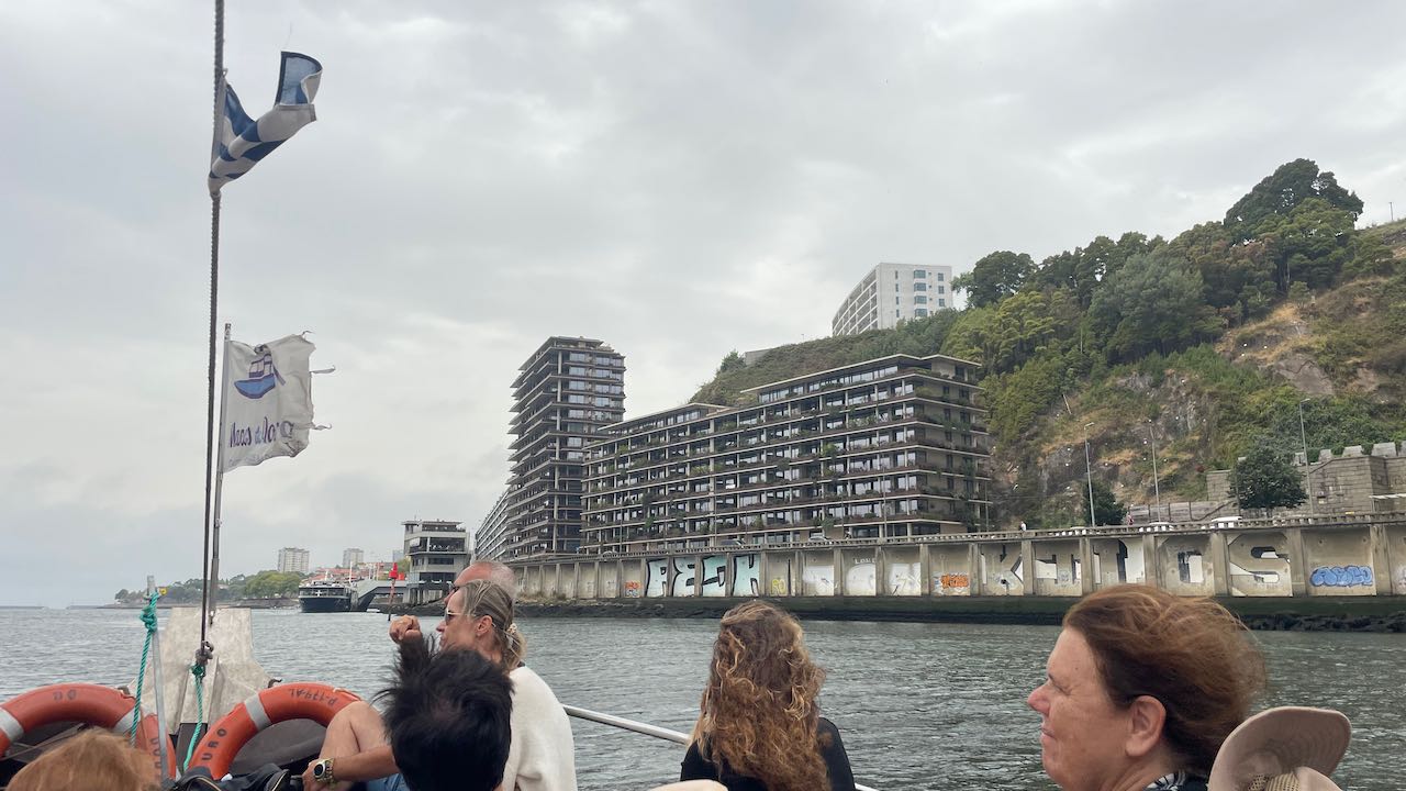 Vor Afurada wendet der Dampfer erneut. Entlang des Ufers stehen die alten Lagerhäuser.