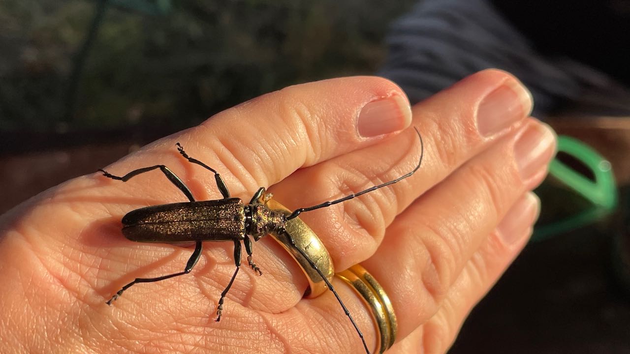 Annette gruselt sich vor den glitzernden Moschusbockkäfer. Sind die nicht schön? Diese Fühler….