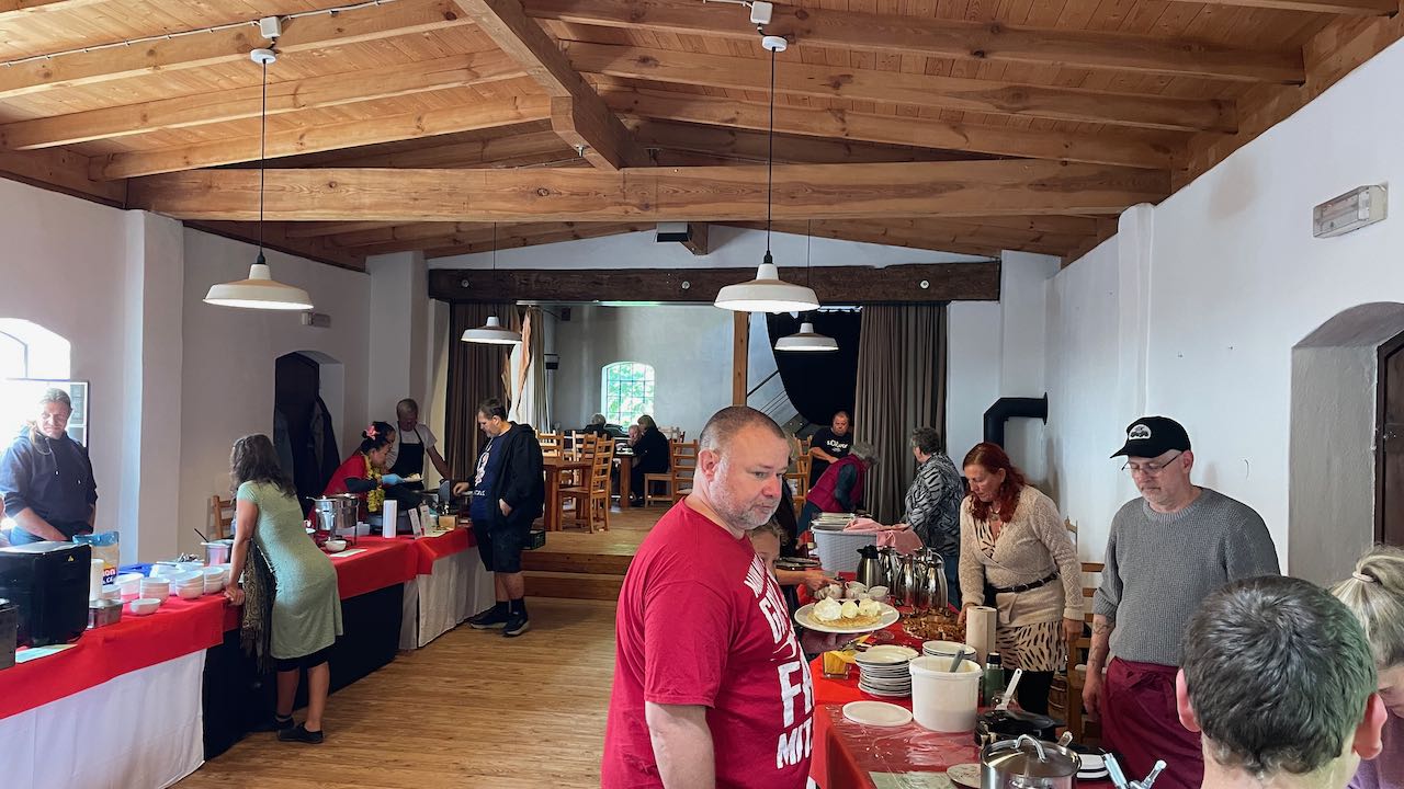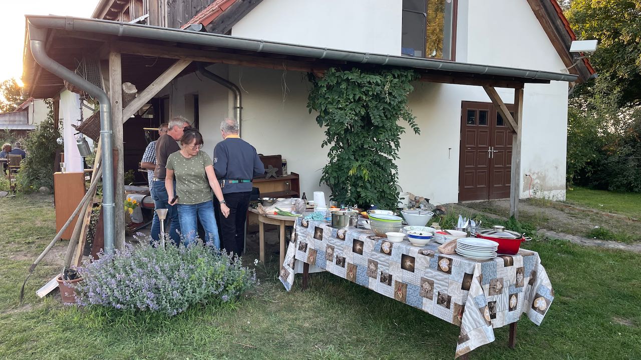 Jeder steuert etwas zum großen Büffet bei. Axel geht mit einem Teller voll kleingeschnittener Bratwurst durch die Reihen: „Noch etwas Wurstkonfekt? Möchte noch jemand etwas Wurstkonfekt?“