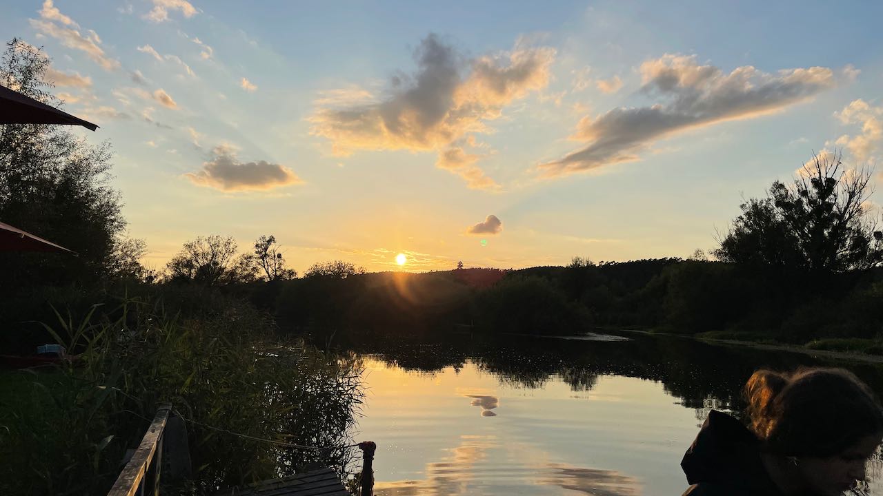 Der Abend ist so schön, wir sitzen am See, füttern die Mücken und bleiben, bis es stockfinster ist.