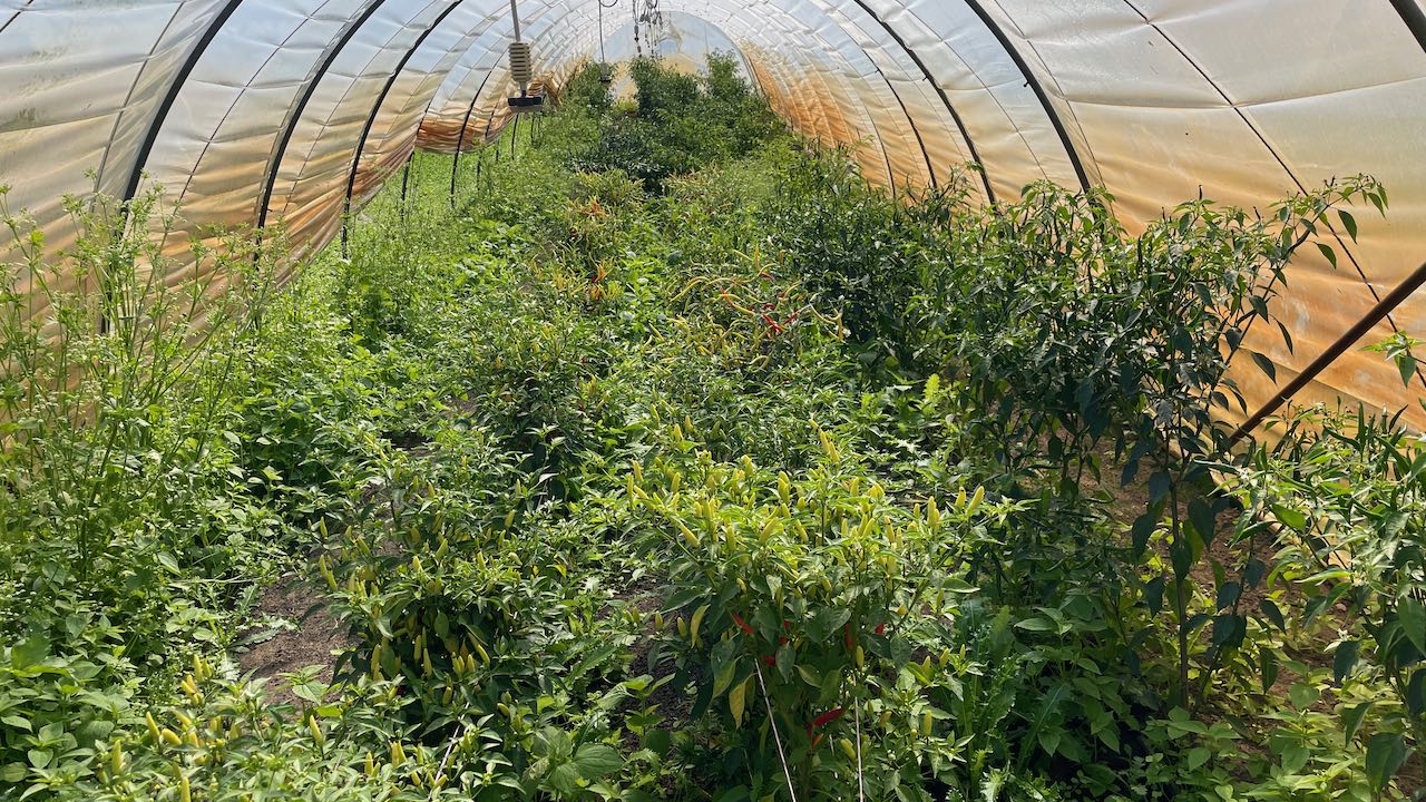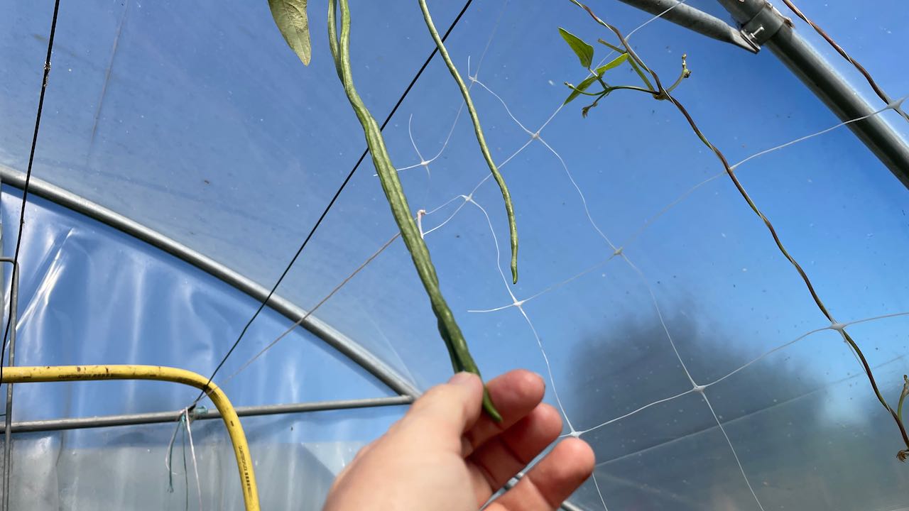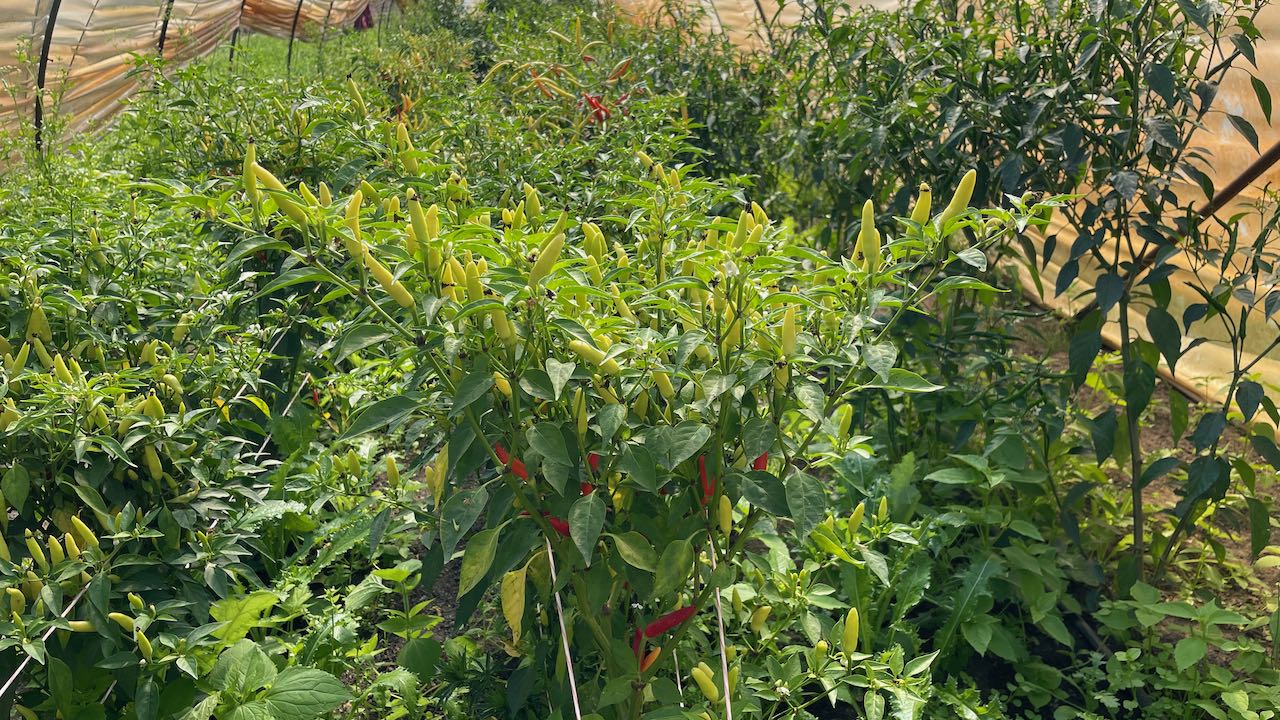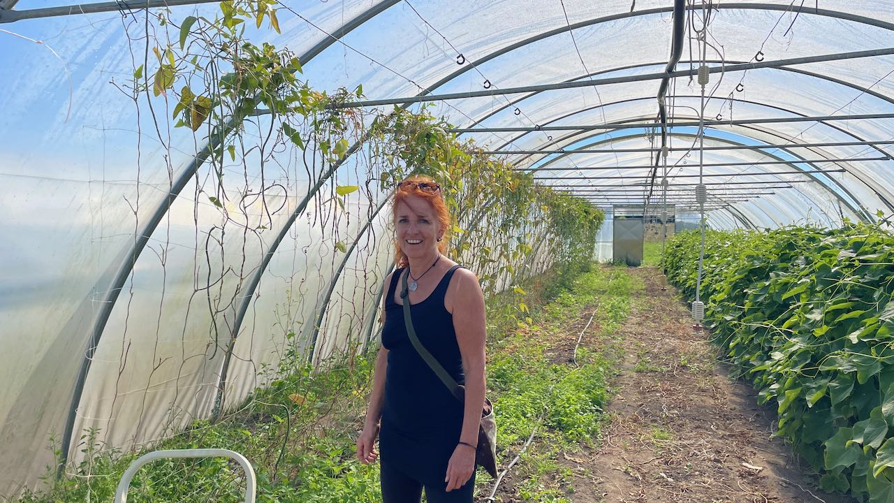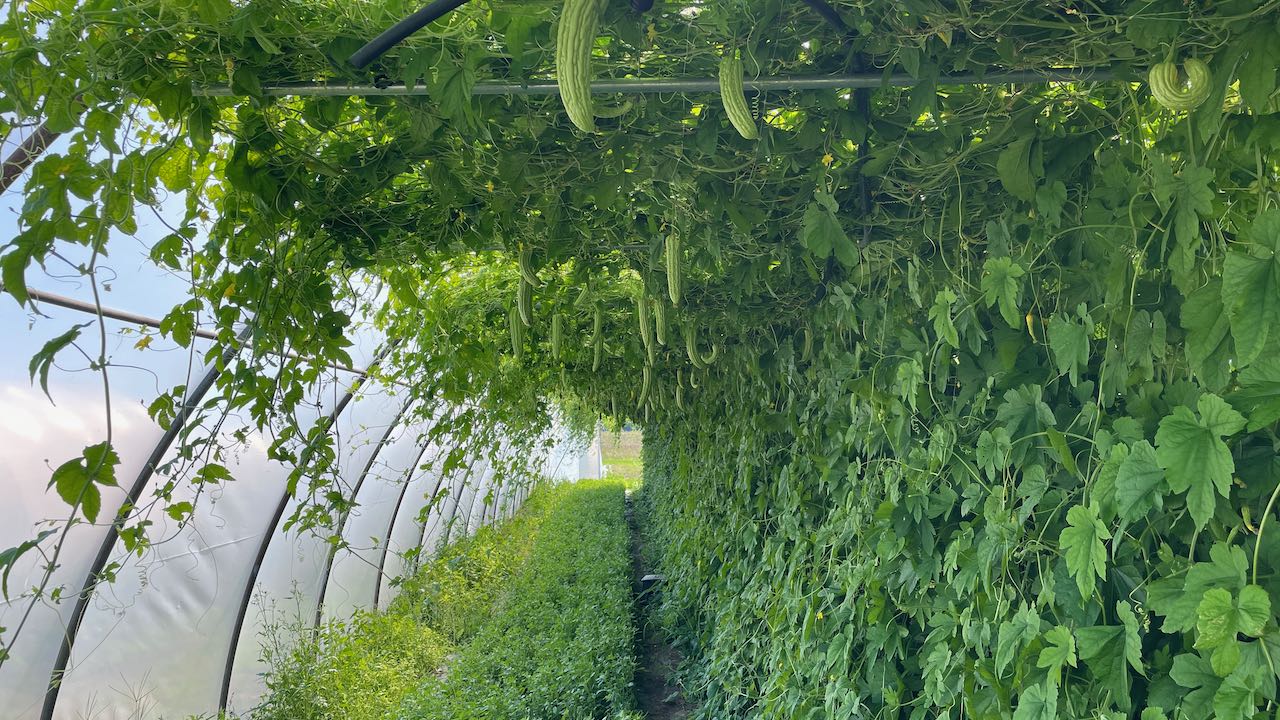 In den Gewächshäusern wird Thai – Gemüse angebaut. Ellenlange Schlangenbohnen pendeln hinab, Goya – Gurken bilden einen grünen Tunnel, es duftet intensiv nach Jasmin.