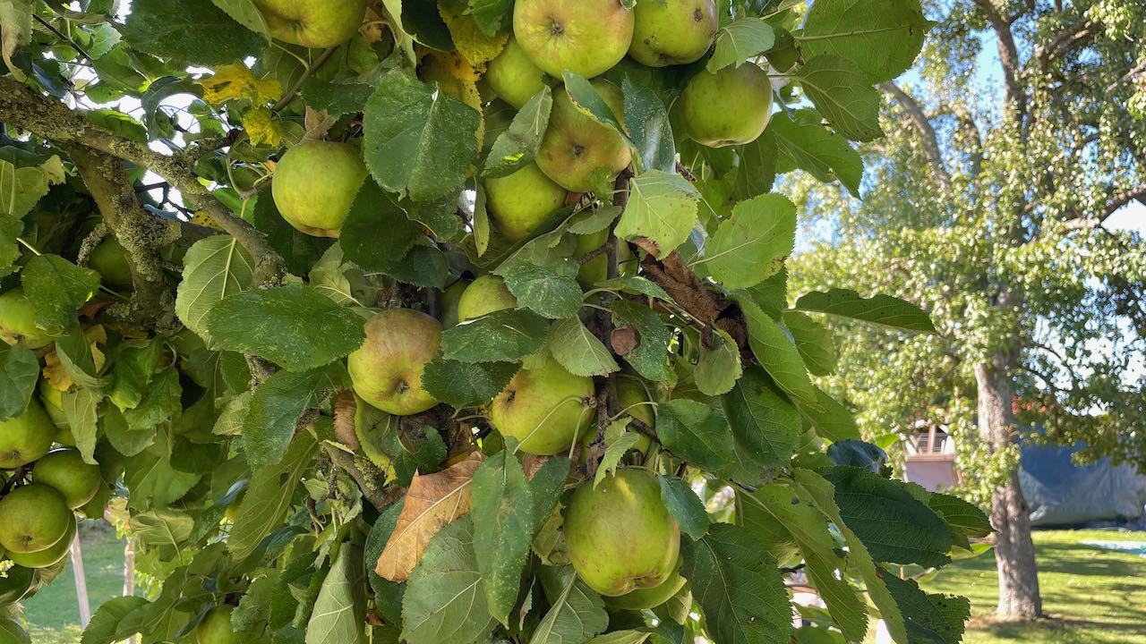 Die Apfelbaumäste hängen schwer beladen nach unten, die Ernte wird super!
